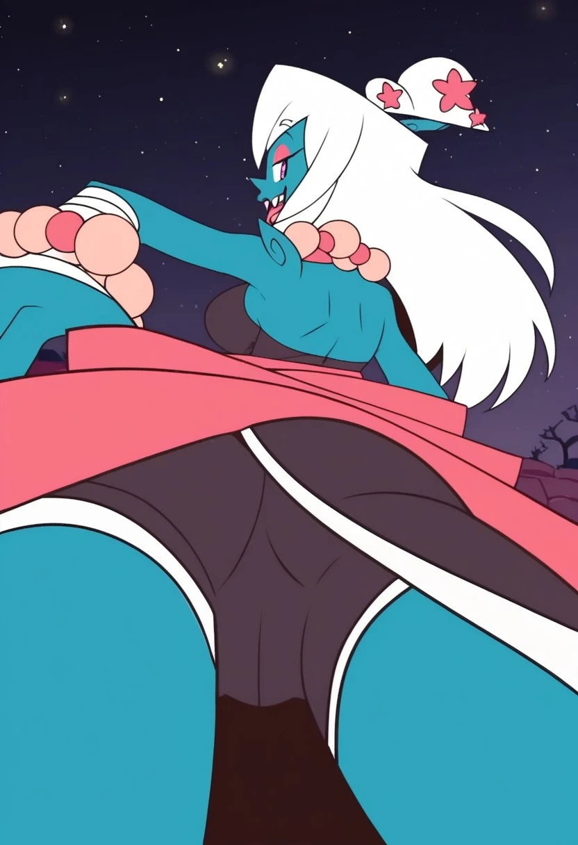 shiromori_msa, 1girl, humanoid, light azure blue skin, small blue and white bonsai tree with pink flowers on the top of her head, shoulder-length white hair, pink eyes, makeup, pink eye shadow, pink lipstick on bottom lip, one sharp fang on the left, orange tongue, long arms, large hands wrapped in white bandages, legs with no feet, pink claw-like nails, large pink beaded necklace, large pink beaded bracelets, white and brown traditional Japanese-style robe (pink sash),