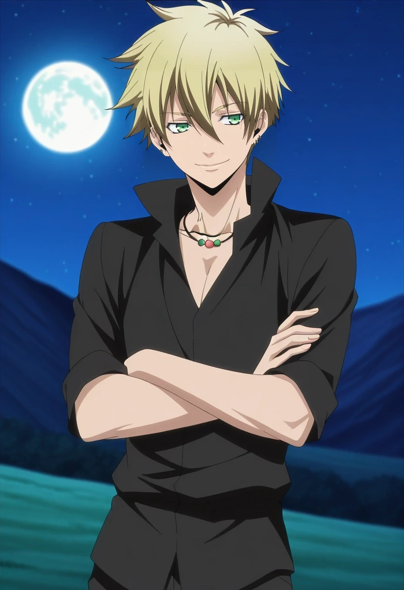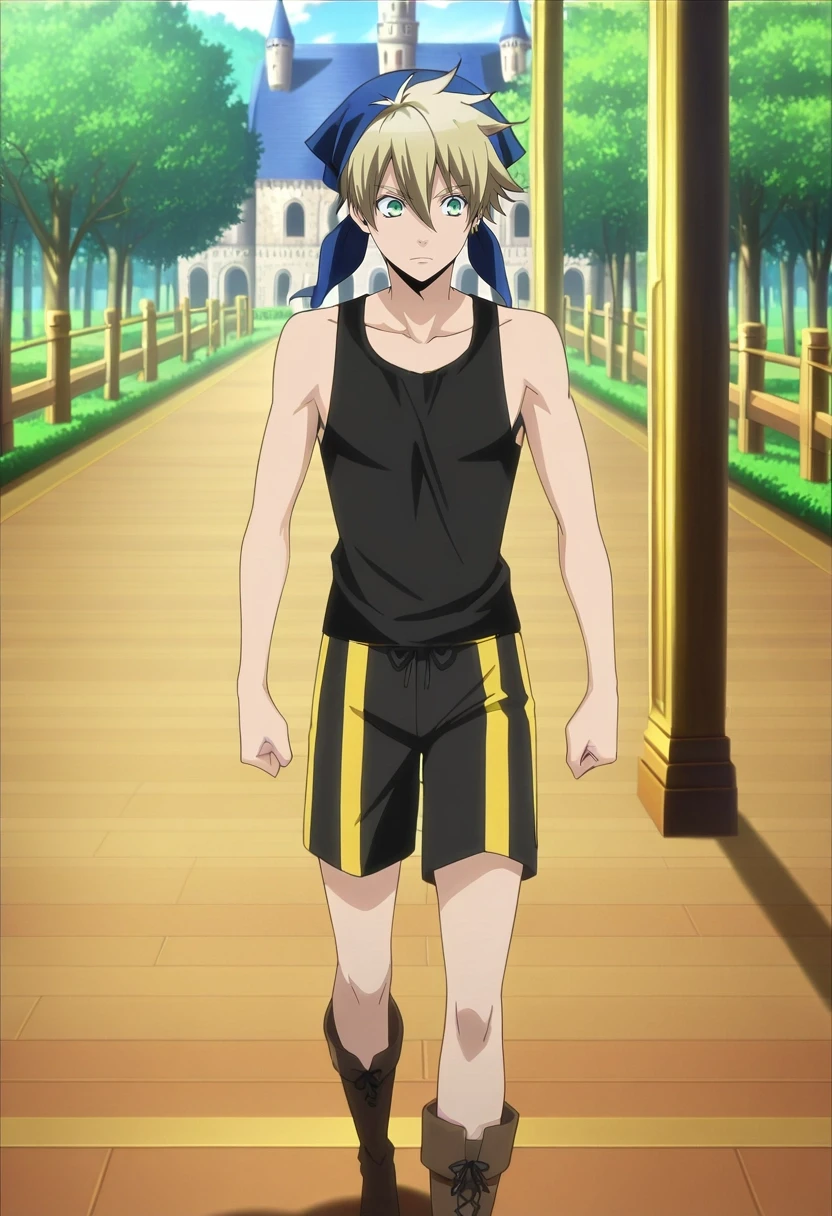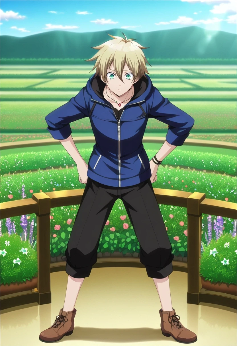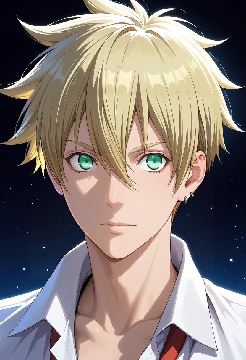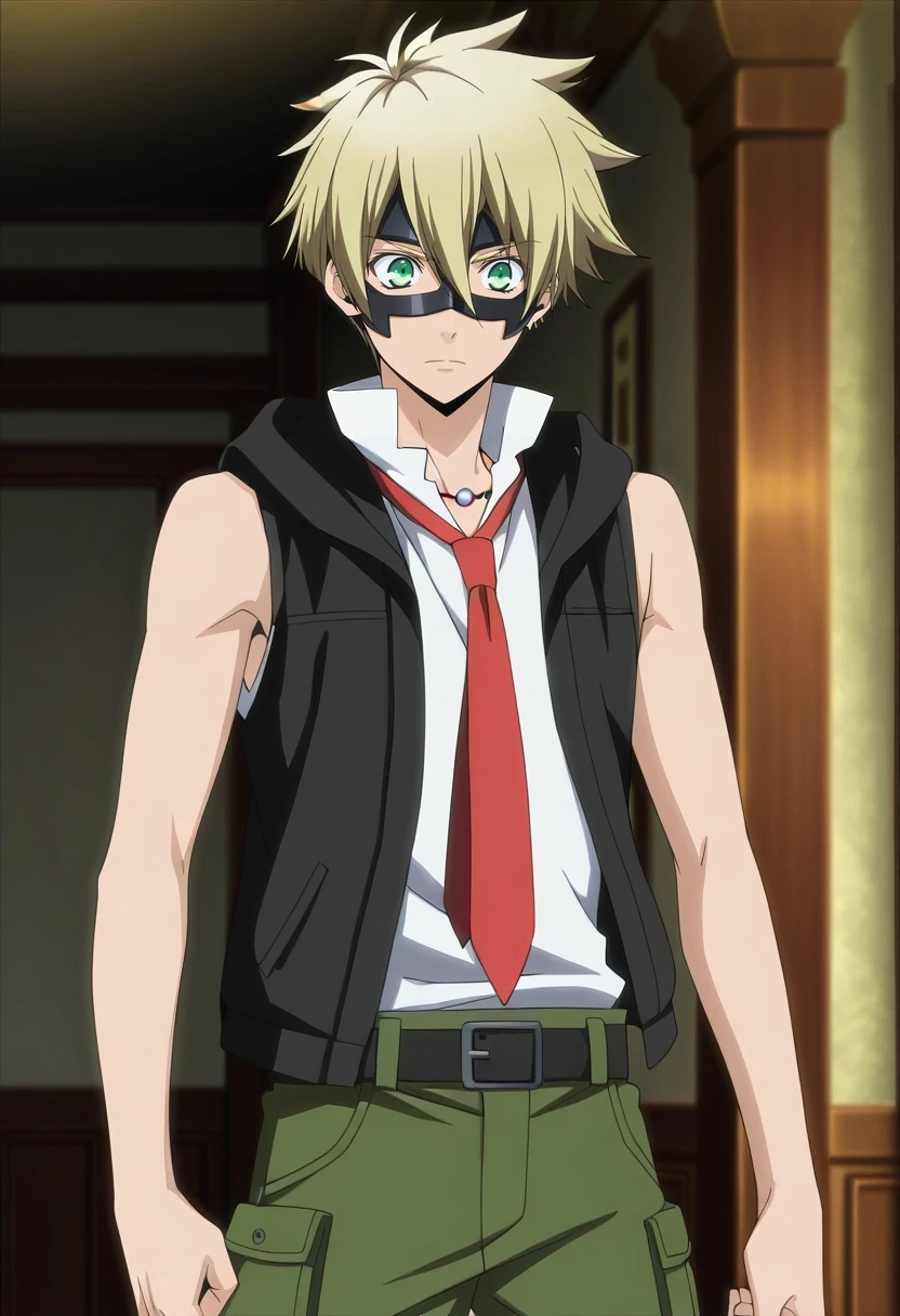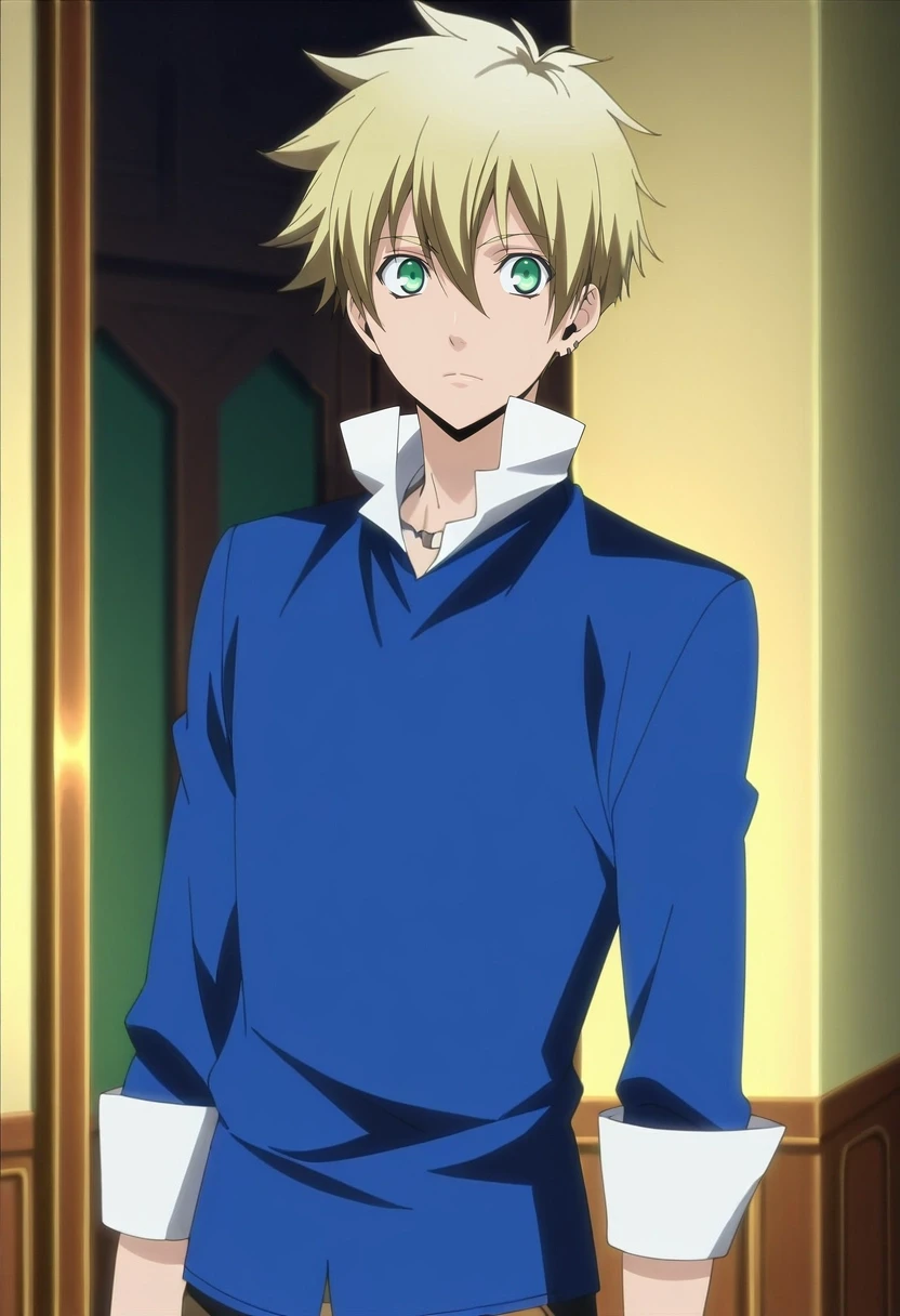 liberta_arcana_famiglia, blonde hair, green eyes, short hair, hair between eyes