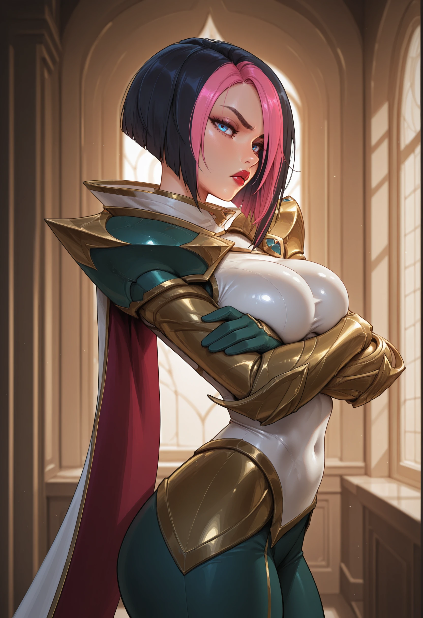 fiorail, short hair, bob cut, asymmetrical hair, streaked hair, black hair, pink hair, multicolored hair, blue eyes, red lips, , gold armor, green armor, cape, shoulder armor, skin tight, high collar, two-sided cape, white cape, red cape, single gauntlet, green glove, green pants,