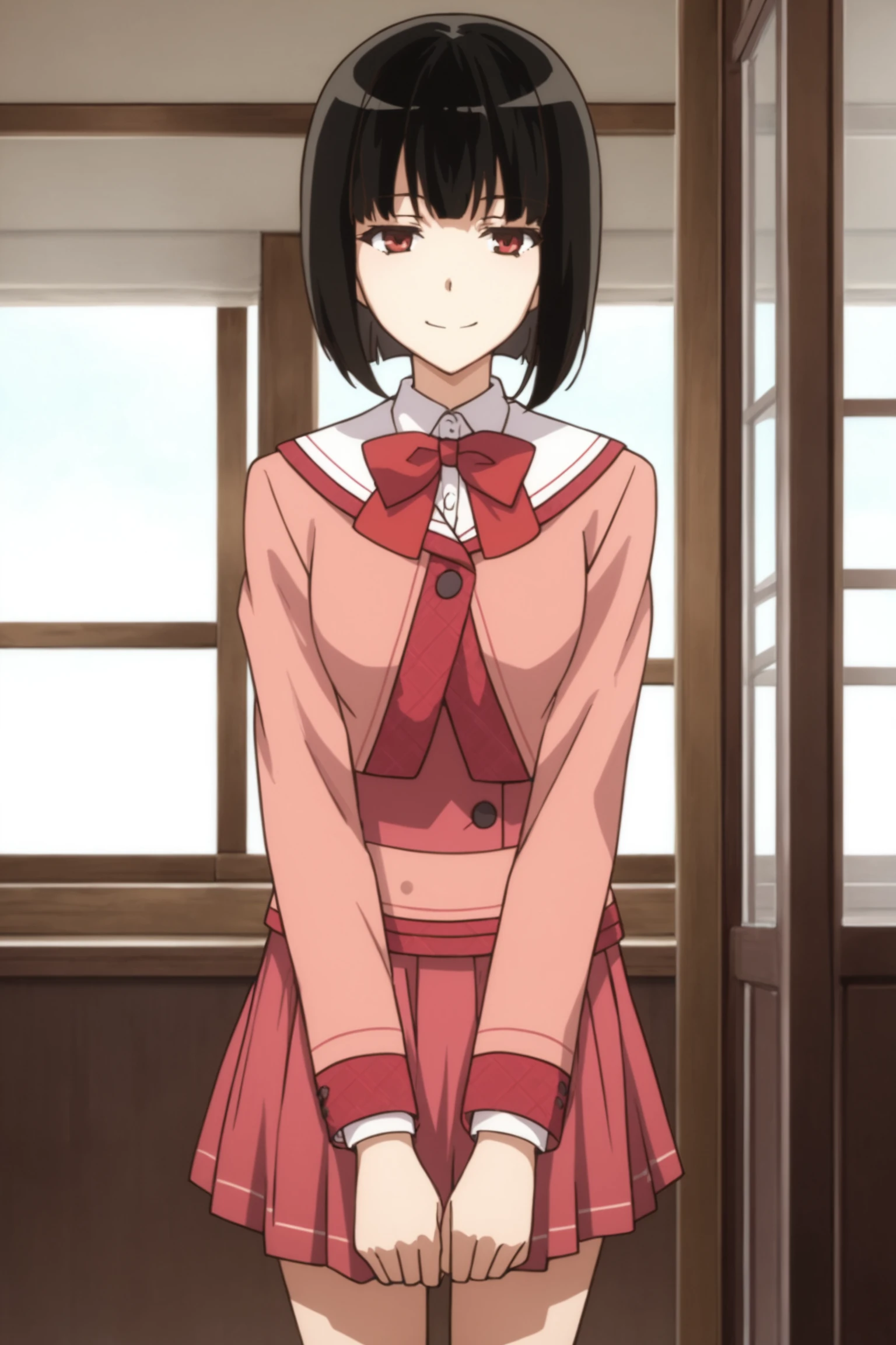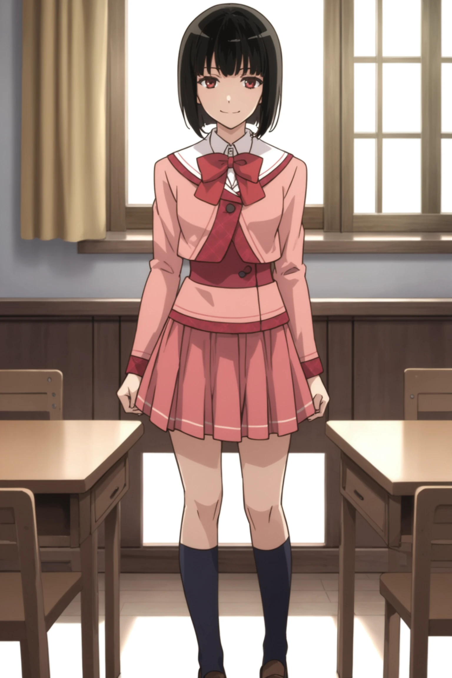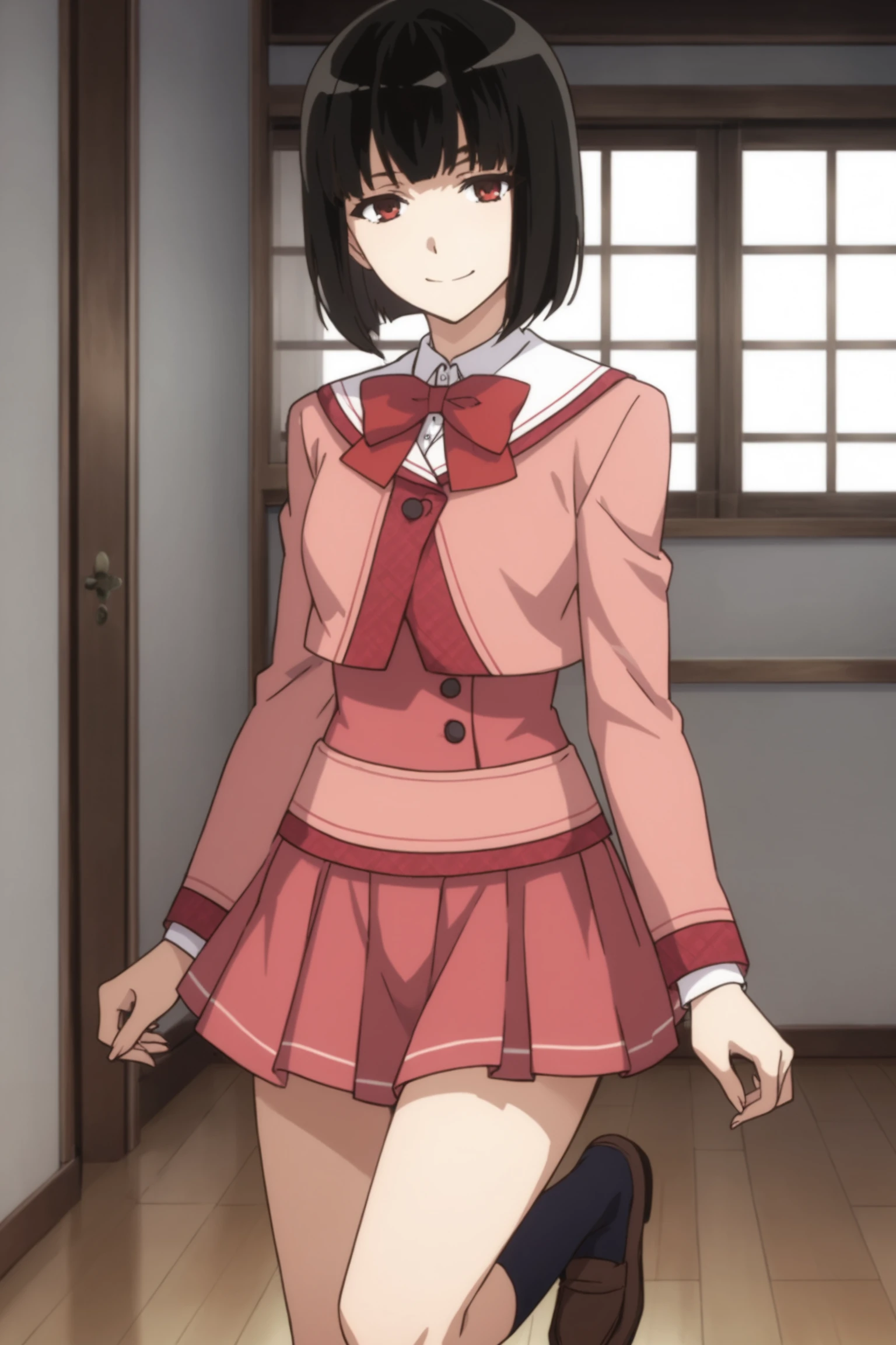 yagami kagami, black hair, short hair, bob cut, red eyes, school uniform, pink uniform, white collar. pink bowtie, pink jacket, pink shirt, pink skirt, pleated skirt, black kneehighs, loafers,