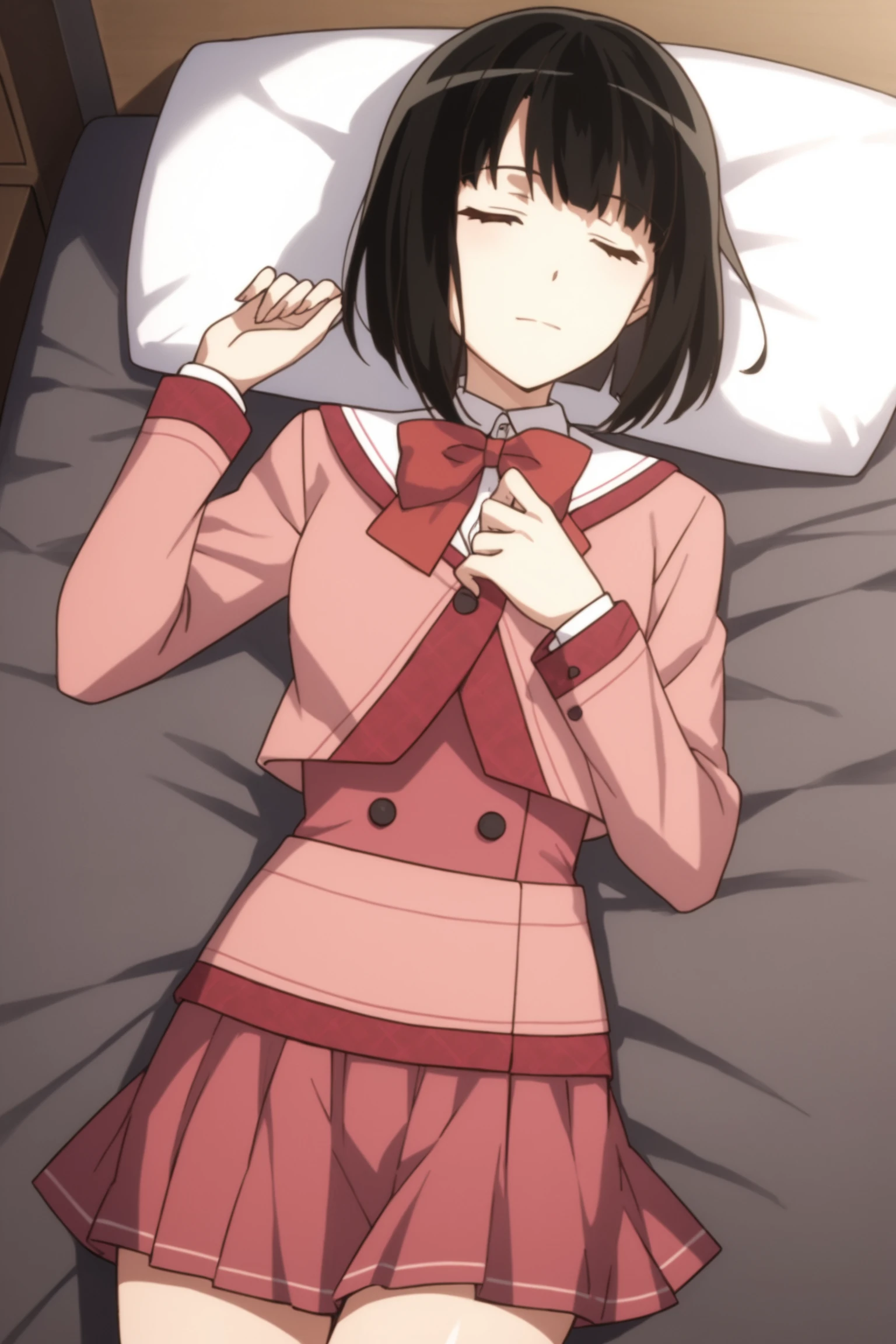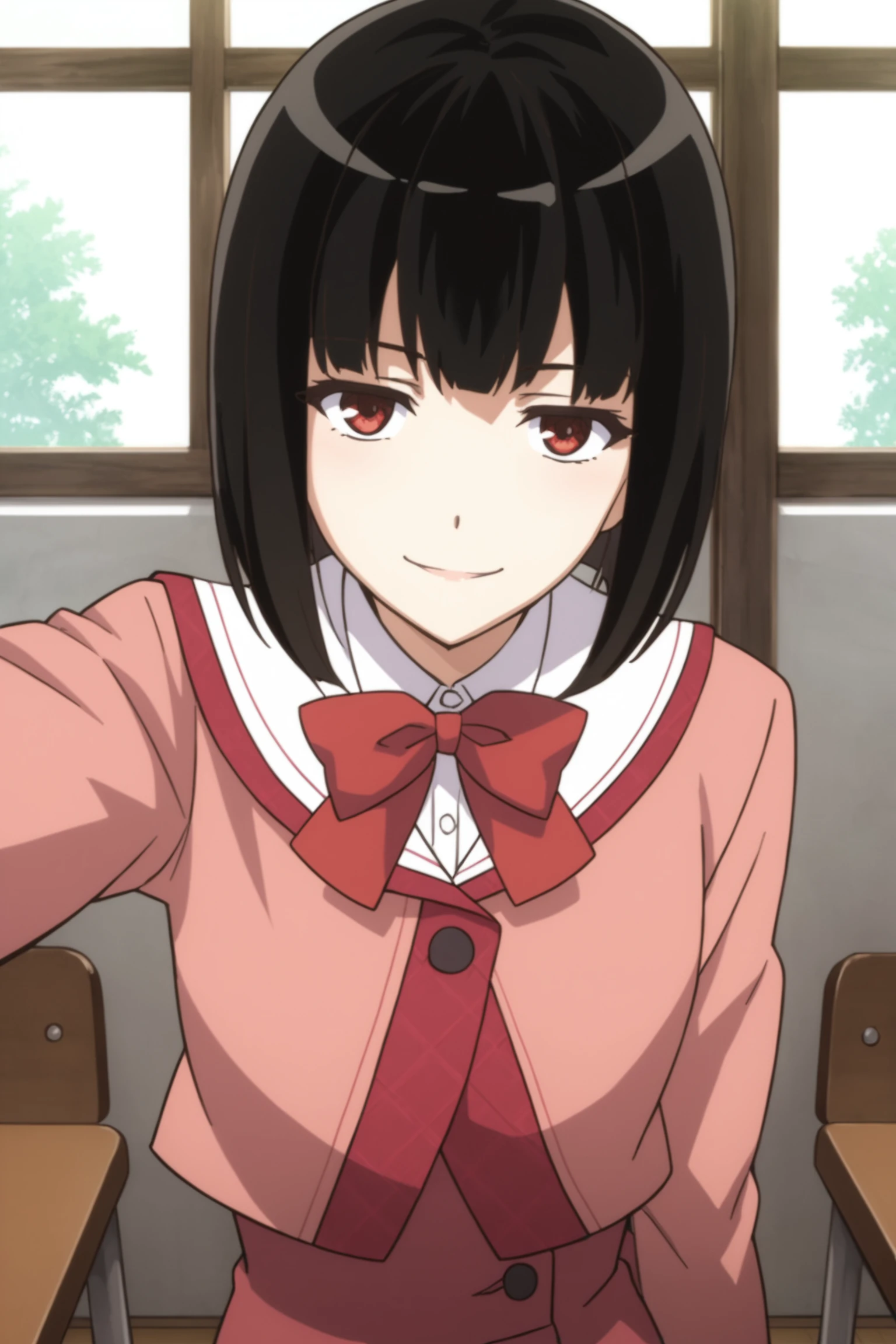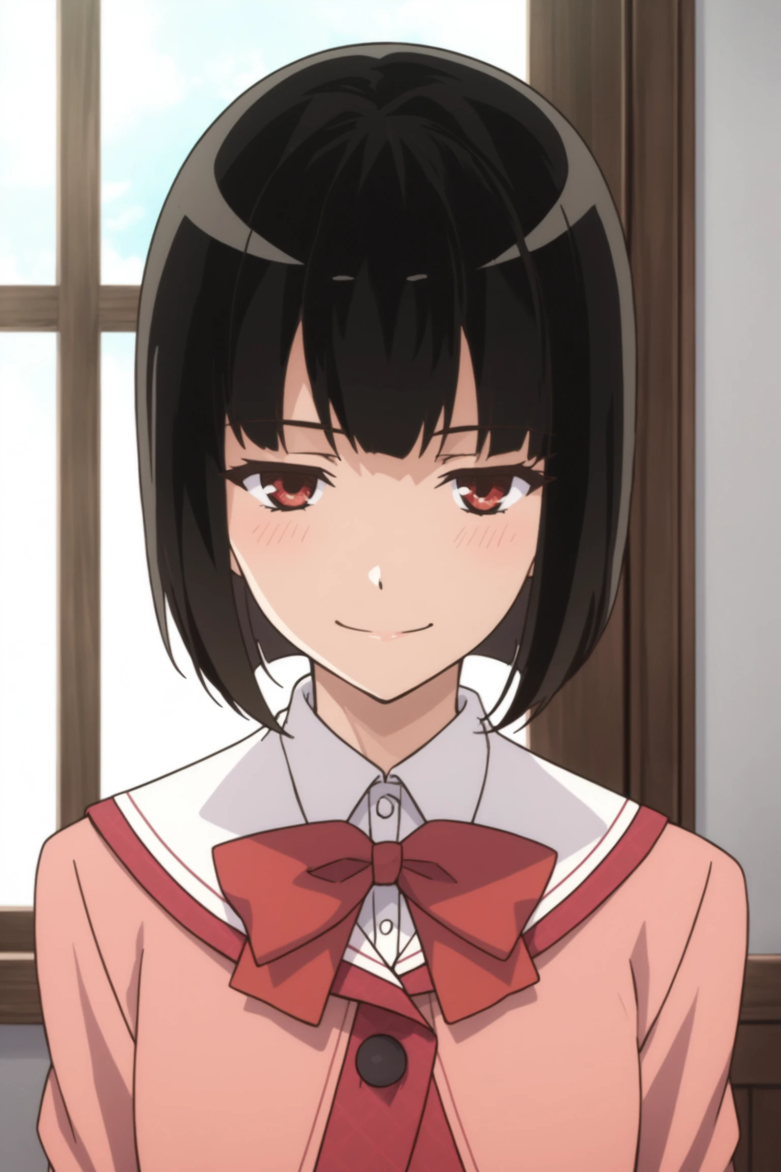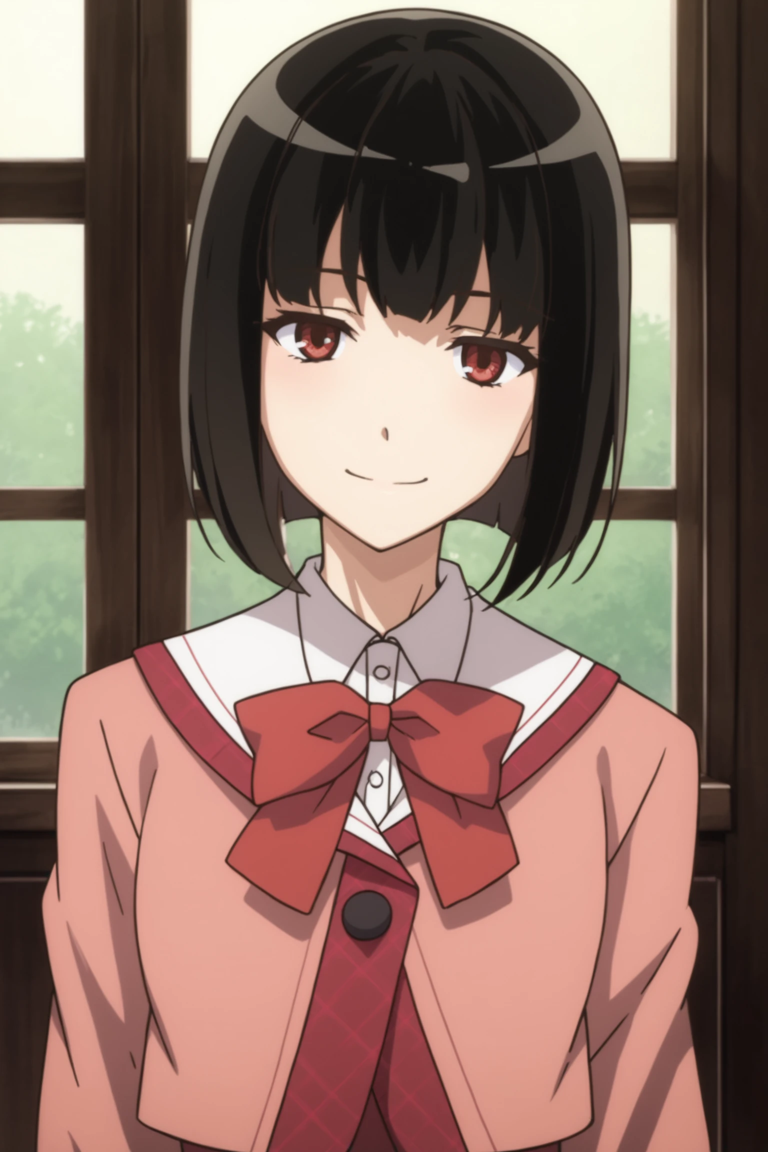 yagami kagami, black hair, short hair, bob cut, red eyes, school uniform, pink uniform, white collar. pink bowtie, pink jacket, pink shirt, pink skirt, pleated skirt, black kneehighs, loafers,