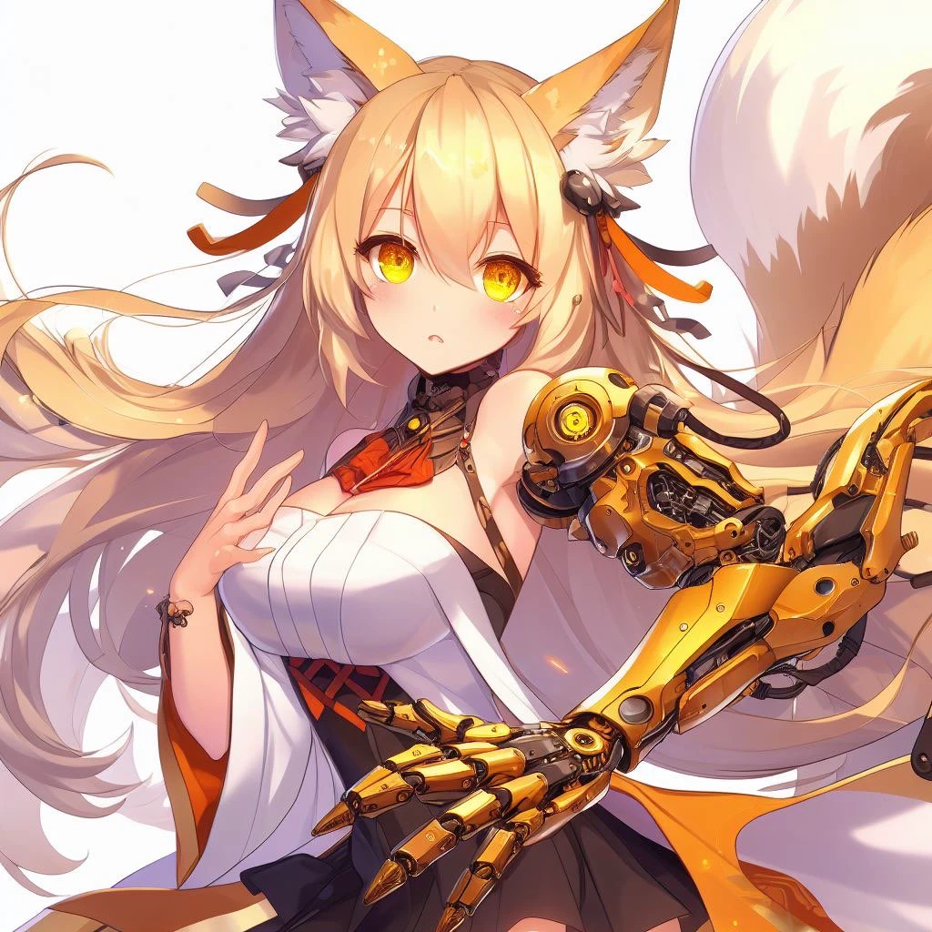 Fenn roe, fox girl, long, blonde hair, 1girl, yellow eyes, single robotic arm, left robotic arm, right normal human arm, single normal human arm, long hair, smug, golden robotic arm, amputee,yellow eyes