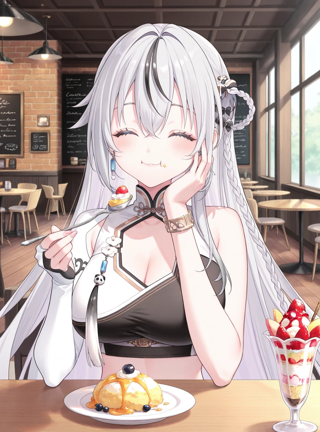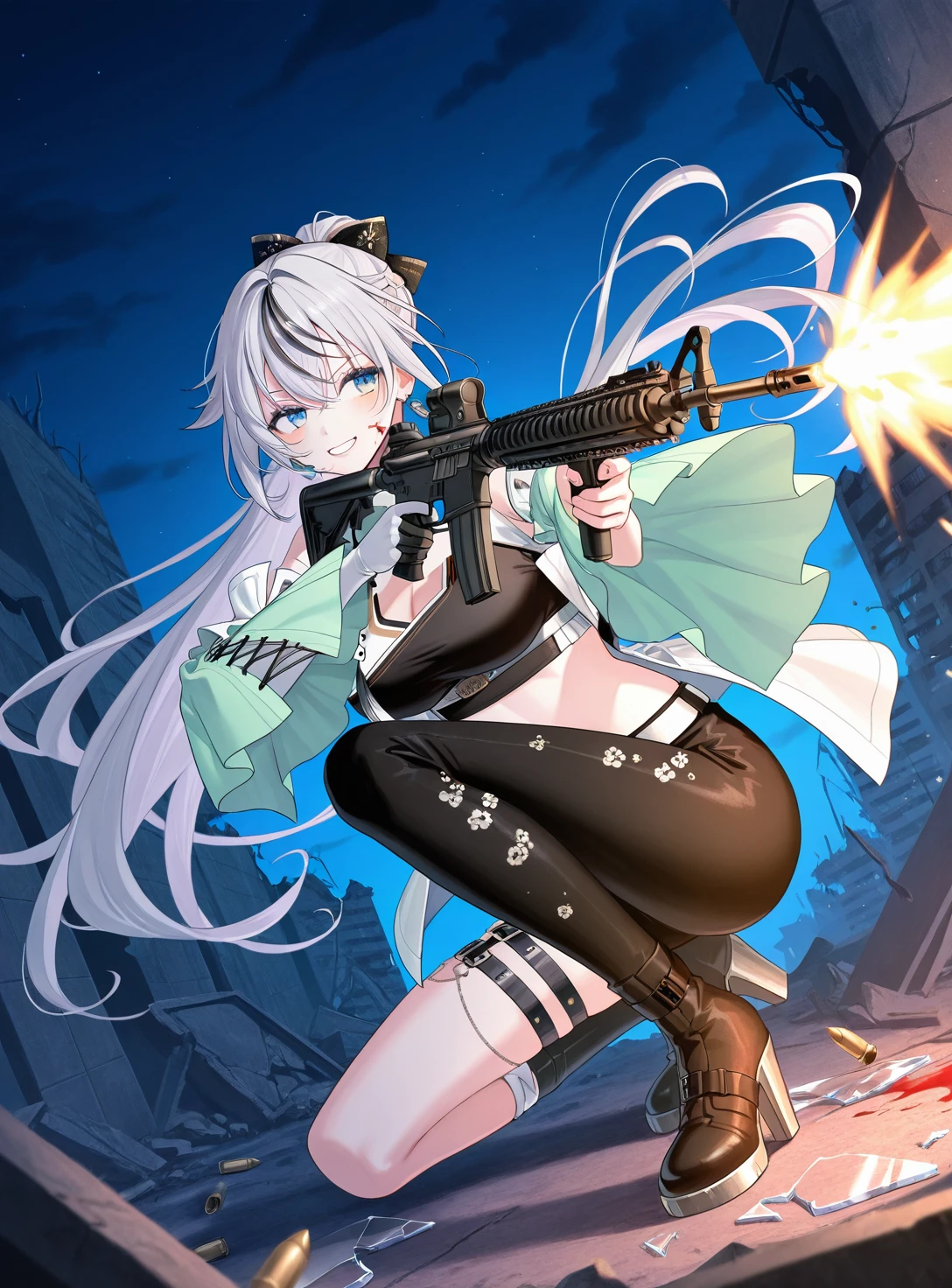 Shirasaki Tsuyuri, long ponytail, chinese hairpin, hair bow, earrings, single sleeve crop top, single bracelet, fingerless glove, single leg pants, thigh strap,