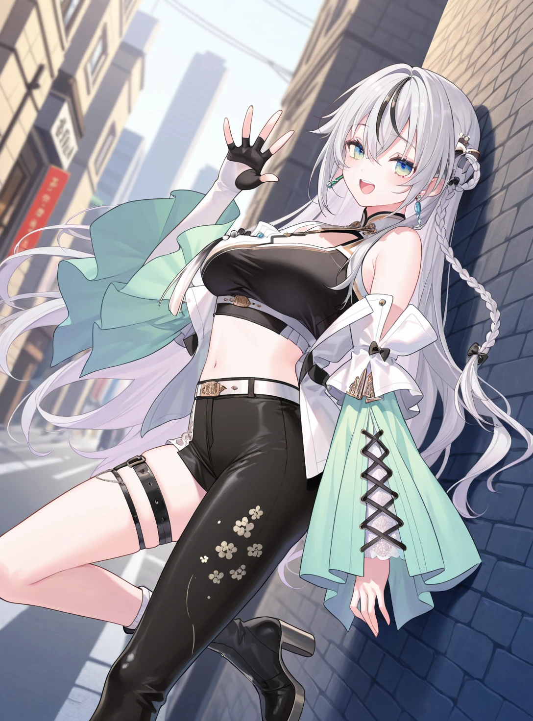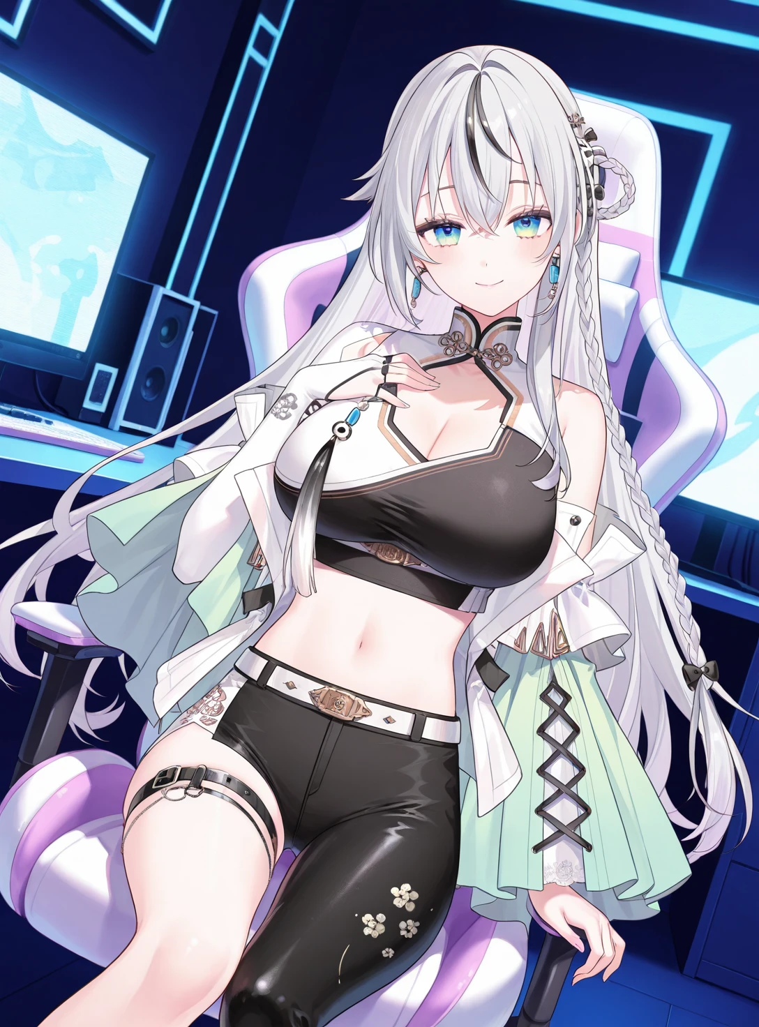 Shirasaki Tsuyuri, long hair, side braid, earrings, single sleeve crop top, wide sleeves jacket, jacket on arm, single leg pants, thigh strap,