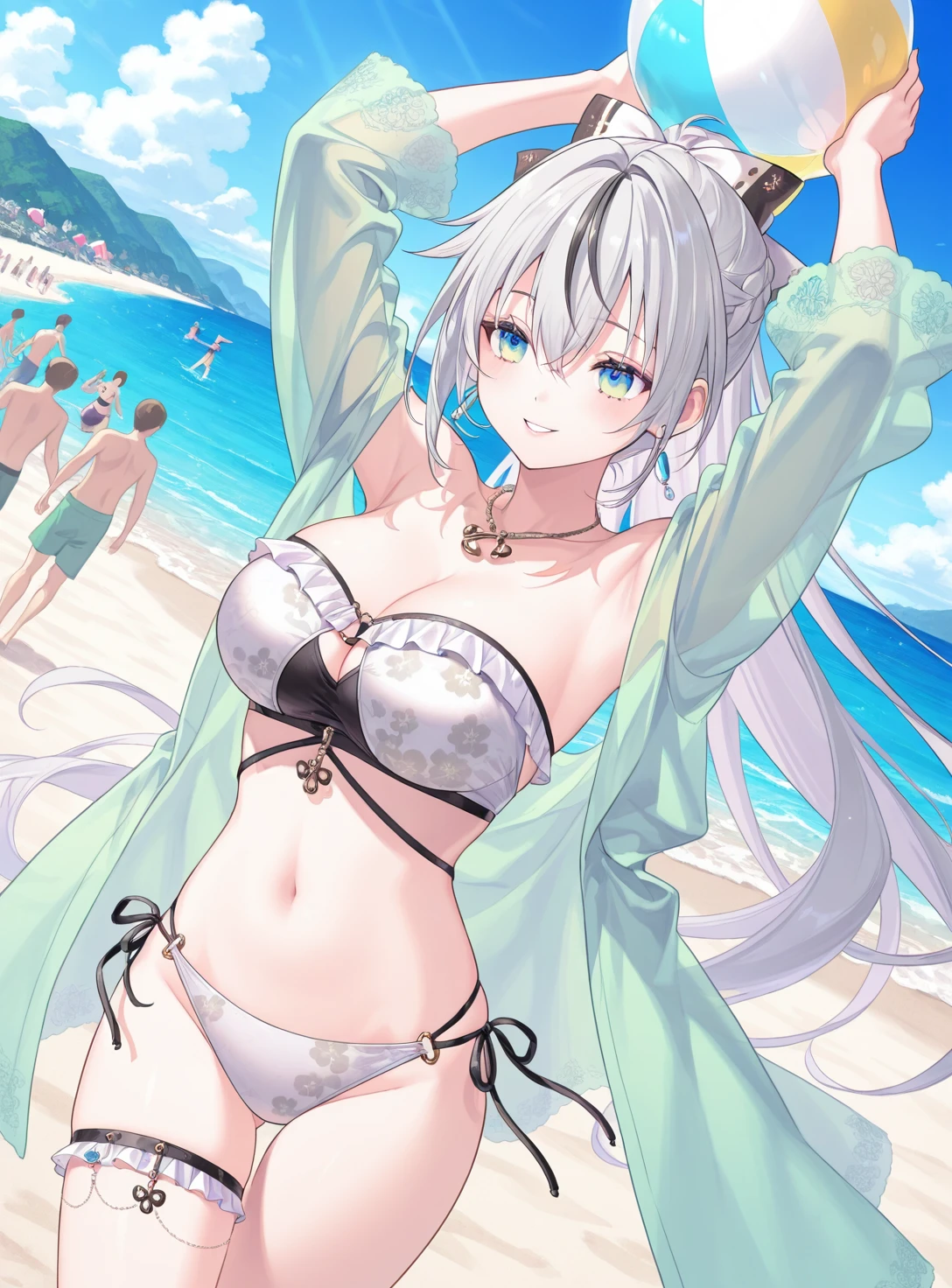 Shirasaki Tsuyuri, long ponytail, head bow, earrings, pendant necklace, frilled , side-tie bottom, swimsuit cover-up, bridal garter,