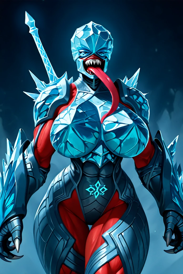 1girl,sharp teeth,no humans,monster,no eyes,long tongue,monster girl,huge breasts,muscular,claws,red skin ,thick thighs,muscular female,