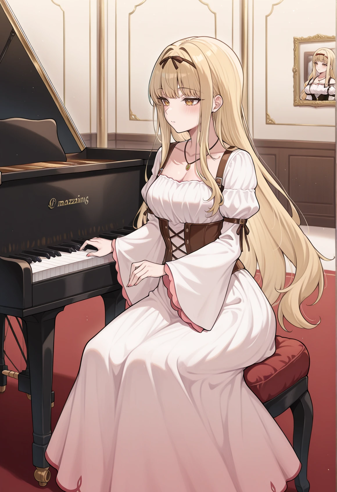 blonde hair, yellow eyes, ribbon, necklace, jewelry, dress, long skirt, corset, wide sleeves, long sleeves