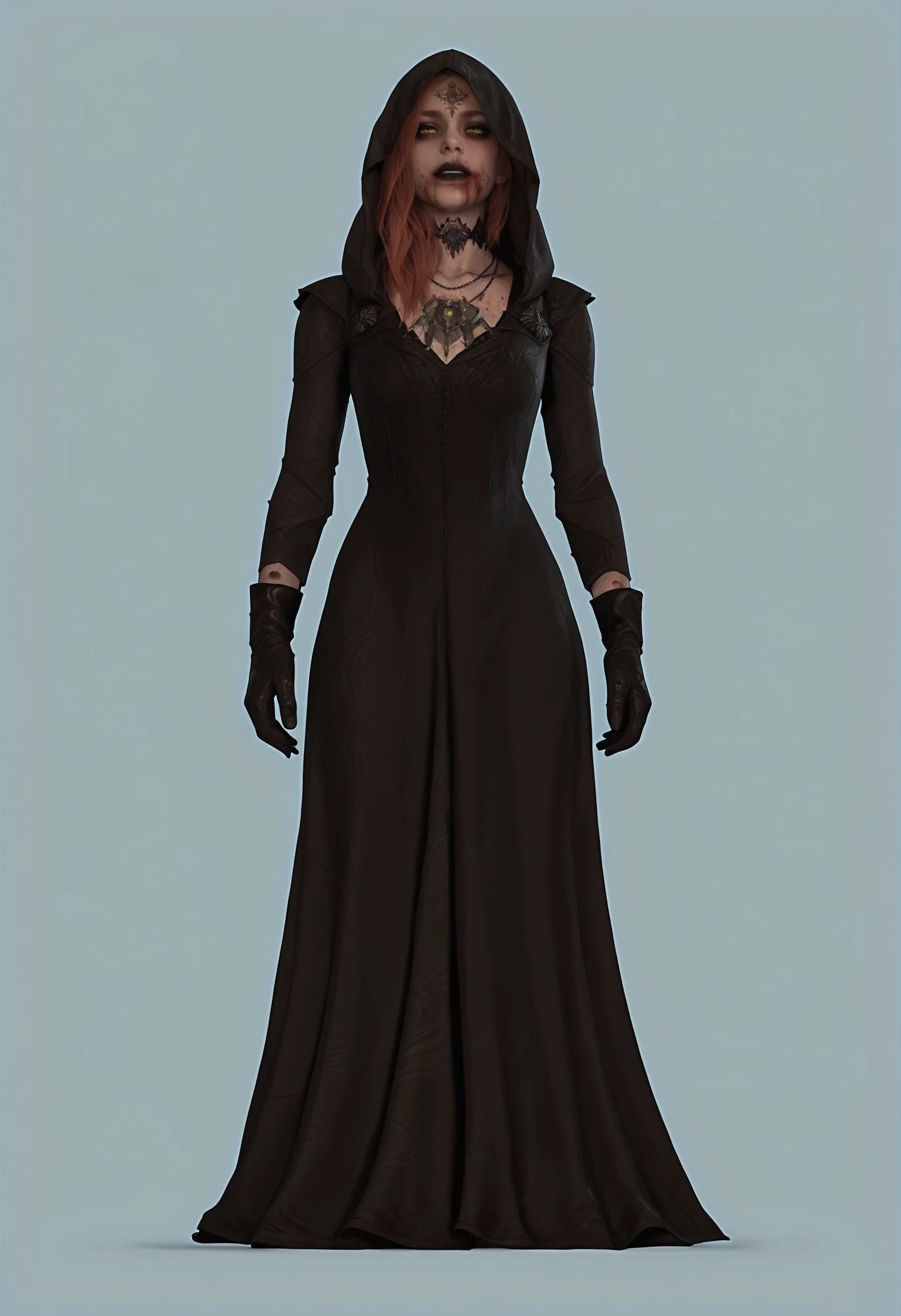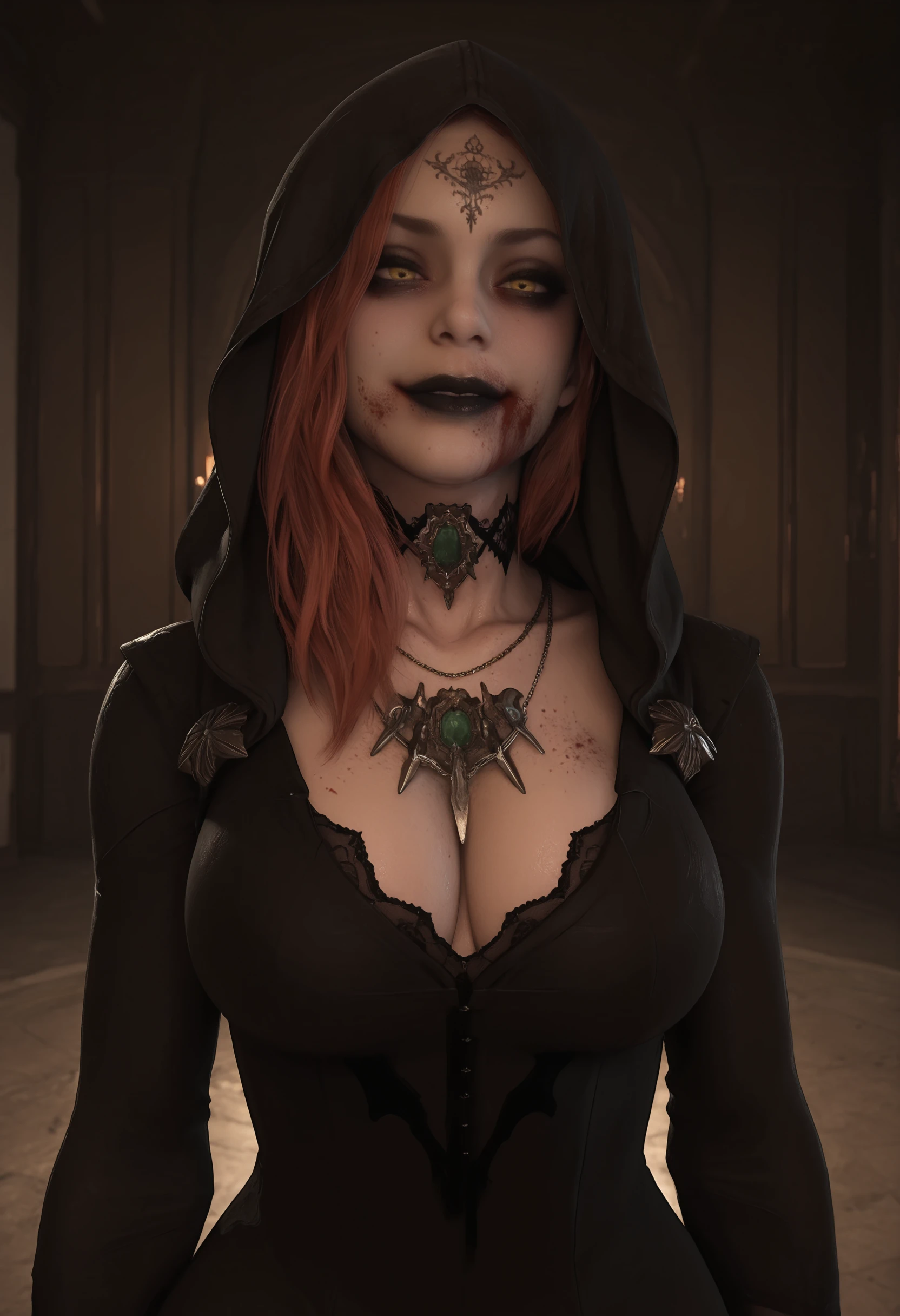 d4nilf, 1girl, forehead tattoo, red hair, black lips, yellow eyes, hood, choker, necklace, dress, gloves, blood on face