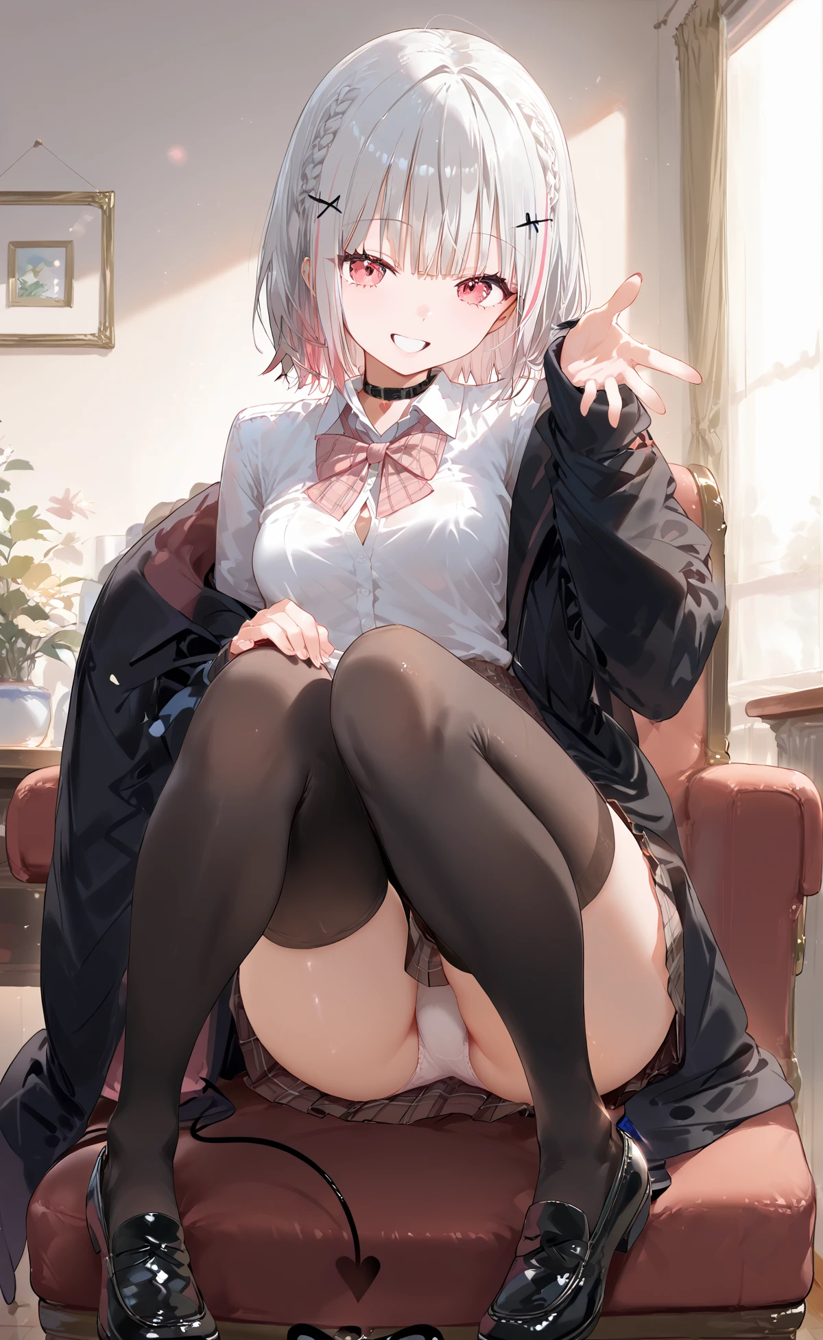 Asumi_Sena,AsumiShirt,white hair,multicolored hair,pink highlight,braid,pink-red eyes,short hair,straight hair,smile,bangs,white shirt,loose bowtie,black hoodie coat,open coat,loose coat,pink inner,open hoodie,long sleeves,plaid skirt,mini skirt,stocking,thighhighs,loafer shoes,small devil tails,Description