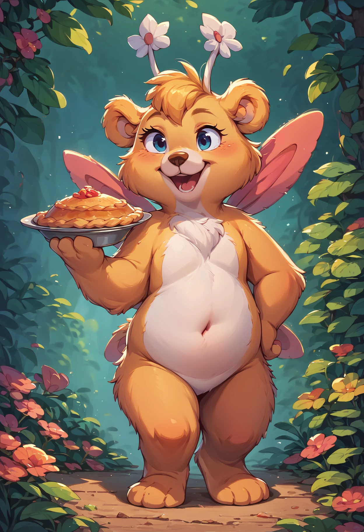 Butterbear, wuzzle, 4 insect wings, antennae, 2 tone body, yellow body, white chest, white belly, white muzzle, blue eyes, bear ears, brown nose, 4 fingers, yellow hair, 3 toes, chest fluff,