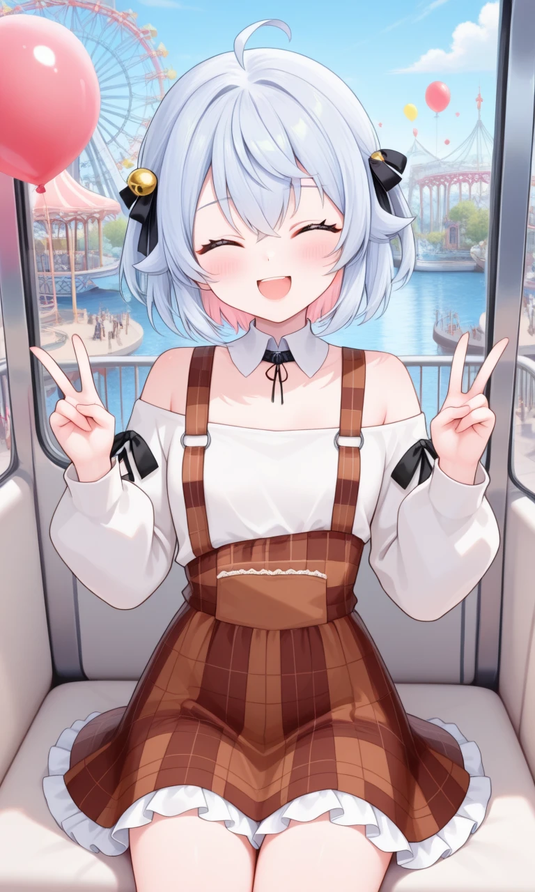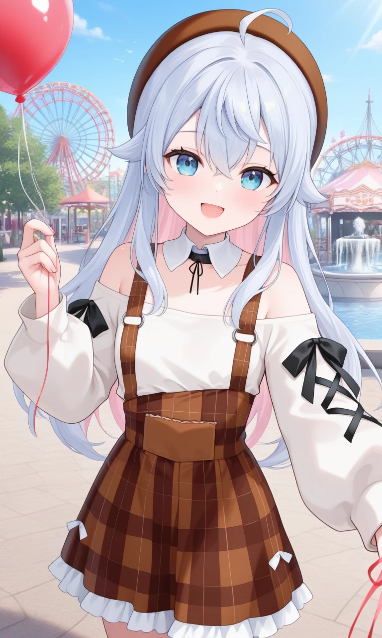 kagura nana, nana fourth, long hair, brown beret, white shirt, off-shoulder shirt, detached collar, puffy long sleeves, cross-laced sleeves, brown skirt, plaid skirt, suspender skirt, frilled skirtYou can change her hairstyle as following;