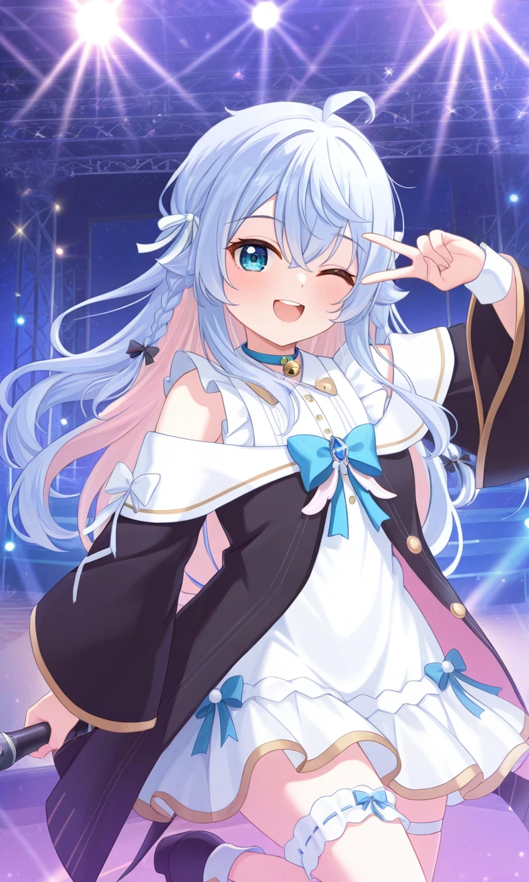 kagura nana, nana second, long hair, hair ribbon, white ribbon, neck bell, choker, braid, alt black jacket, off-shoulder jacket, bow, white dress, thigh strap💌Third outfit :