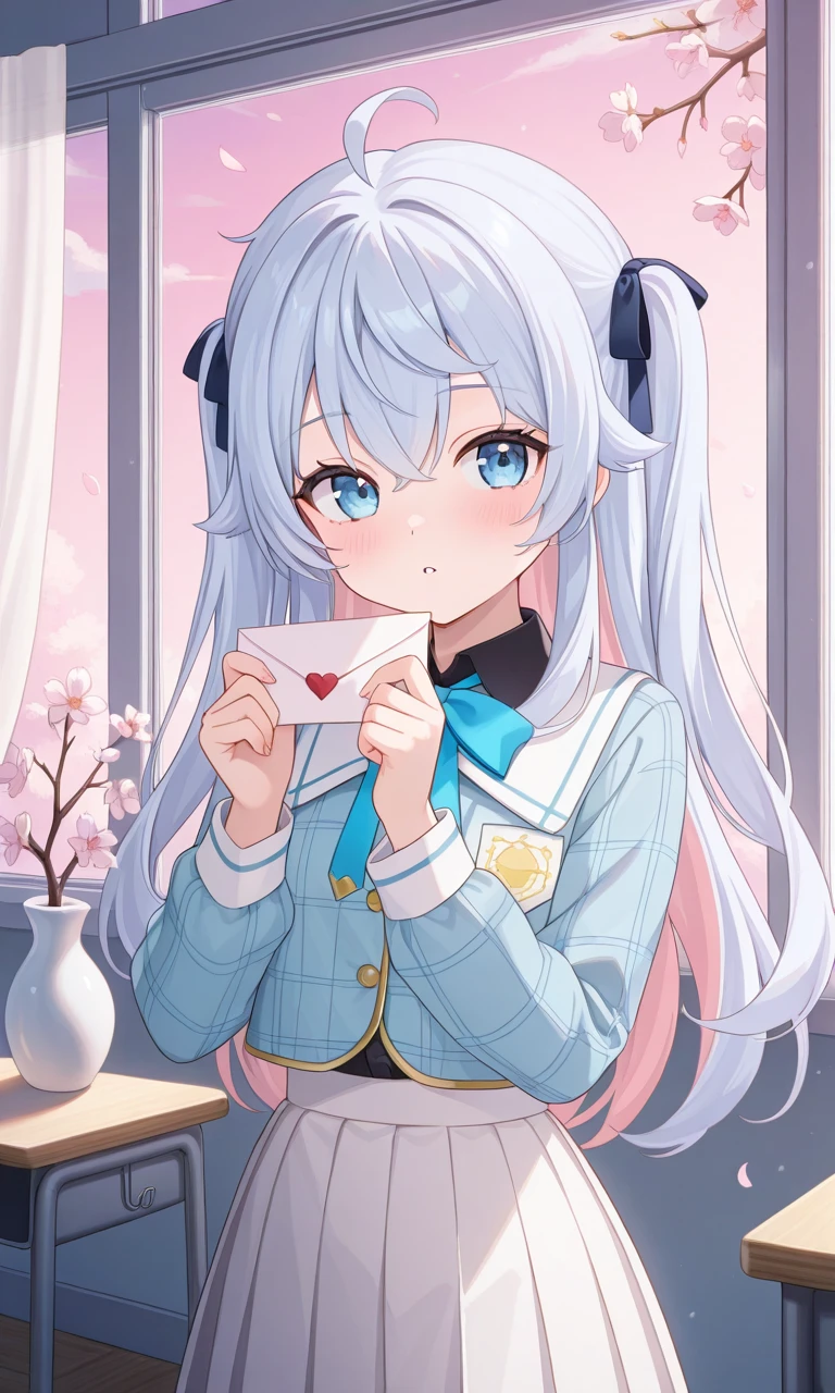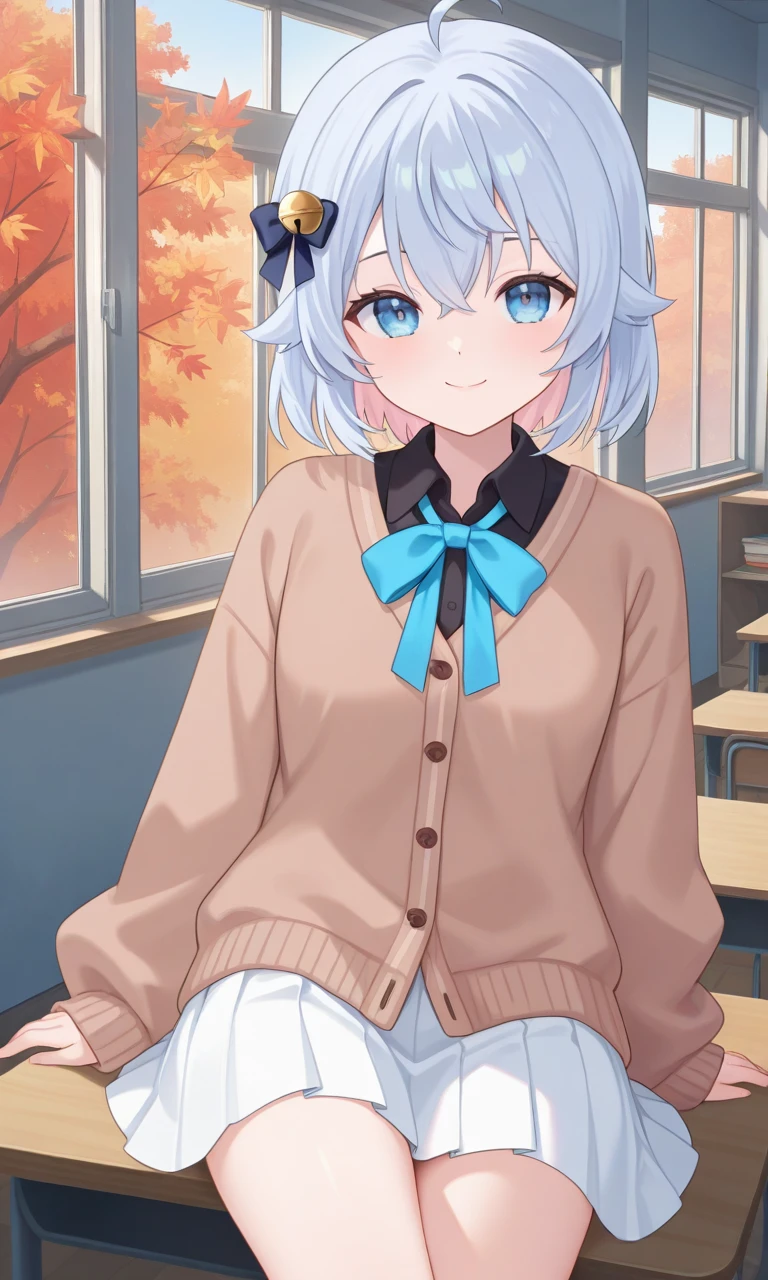 kagura nana, nana third, long hair, two side up, hair ribbon, black shirt, blue bowtie, collared shirt, blue jacket, plaid jacket, white skirt, pleated skirtYou can change her outer using