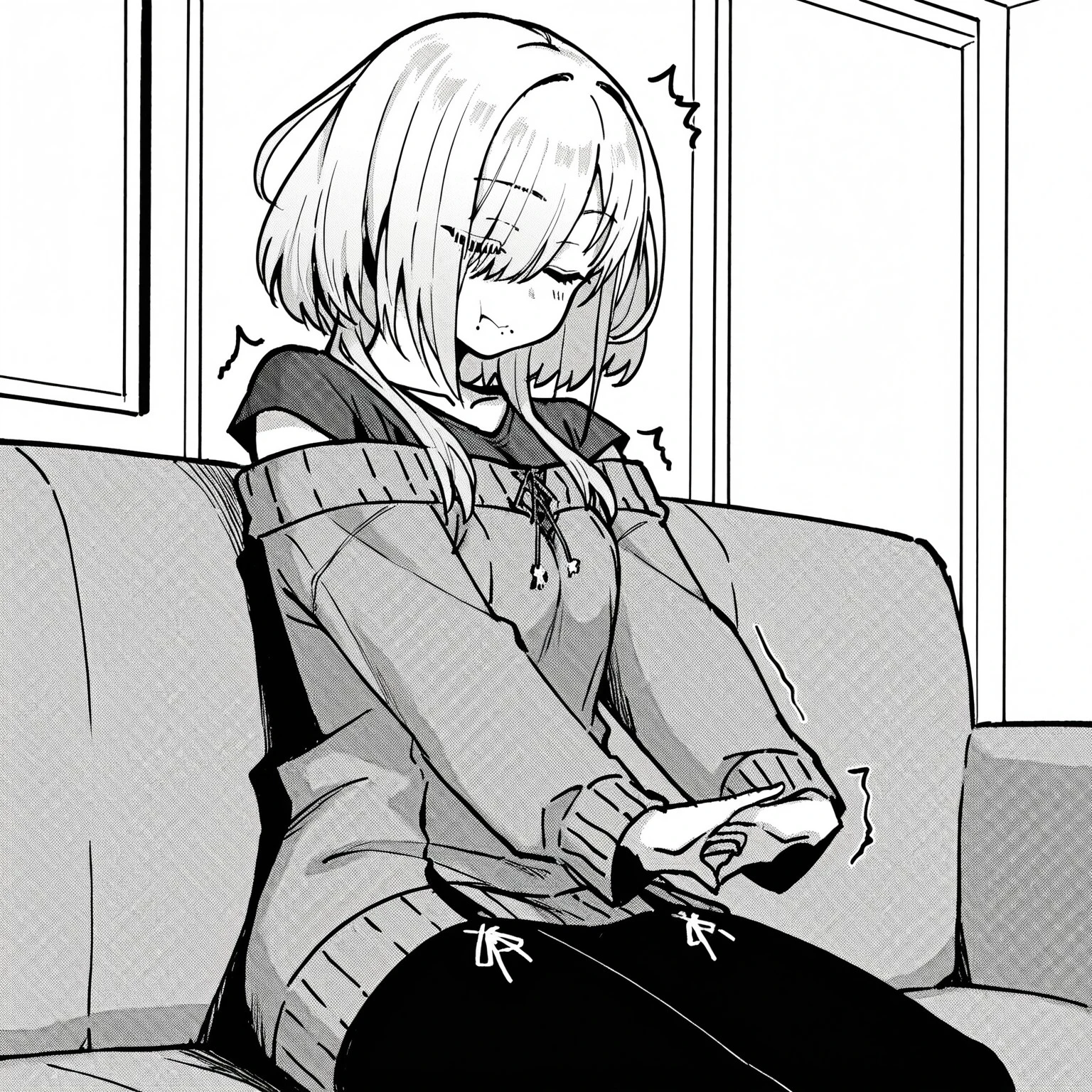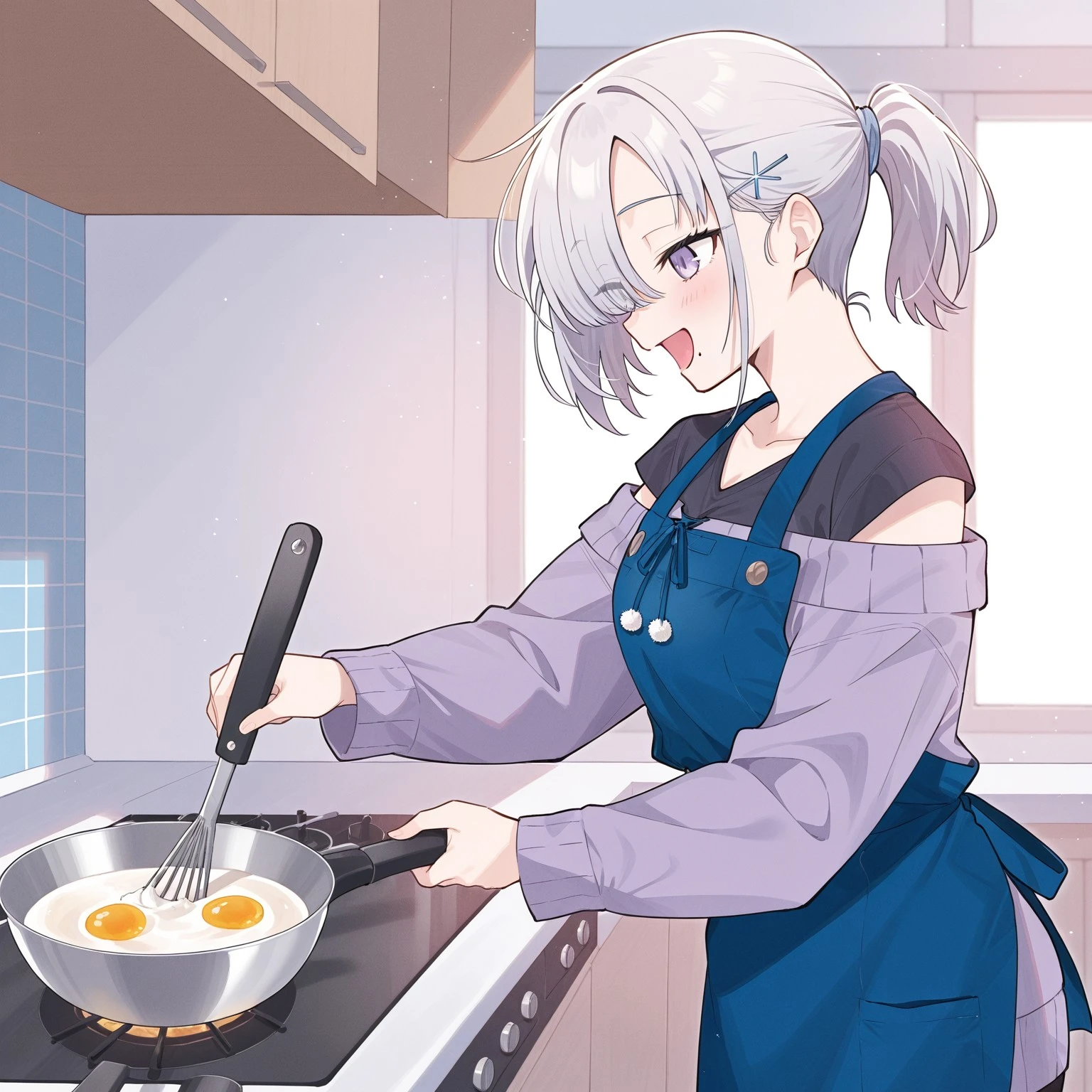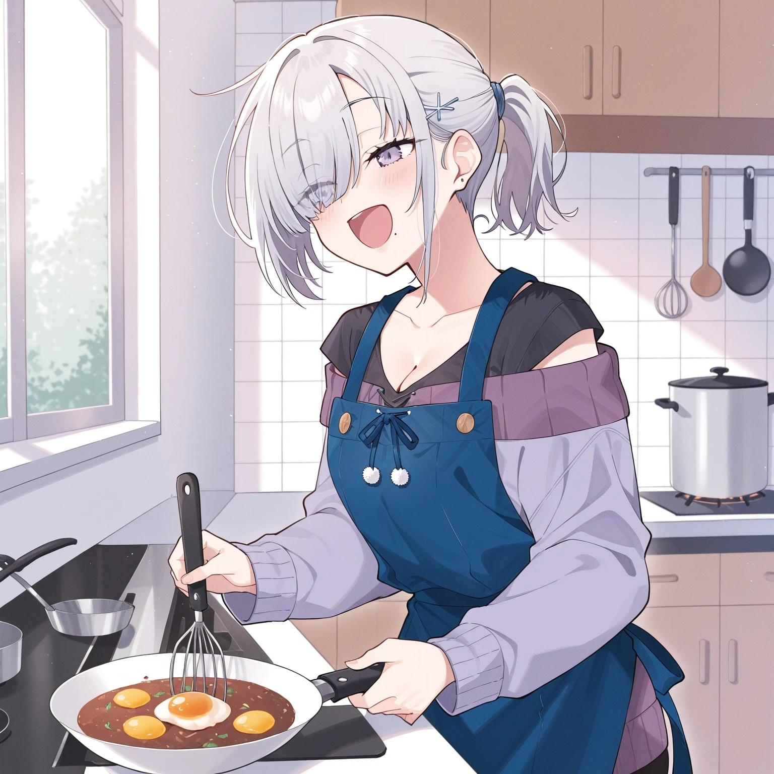 3. ritshome, ponytail, apron, pantyhose, sweater, off shoulder, pants, long sleeves