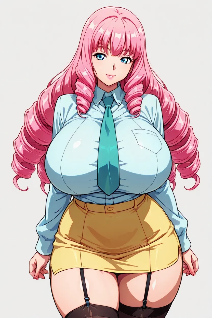 1girl, Matsuki, mature_female, bue_eyes, pink_hair, long_hair, drill_hair, lips, gigantic breasts, wide hips, thick thighs, anime_style, superb quality, anime_coloring,