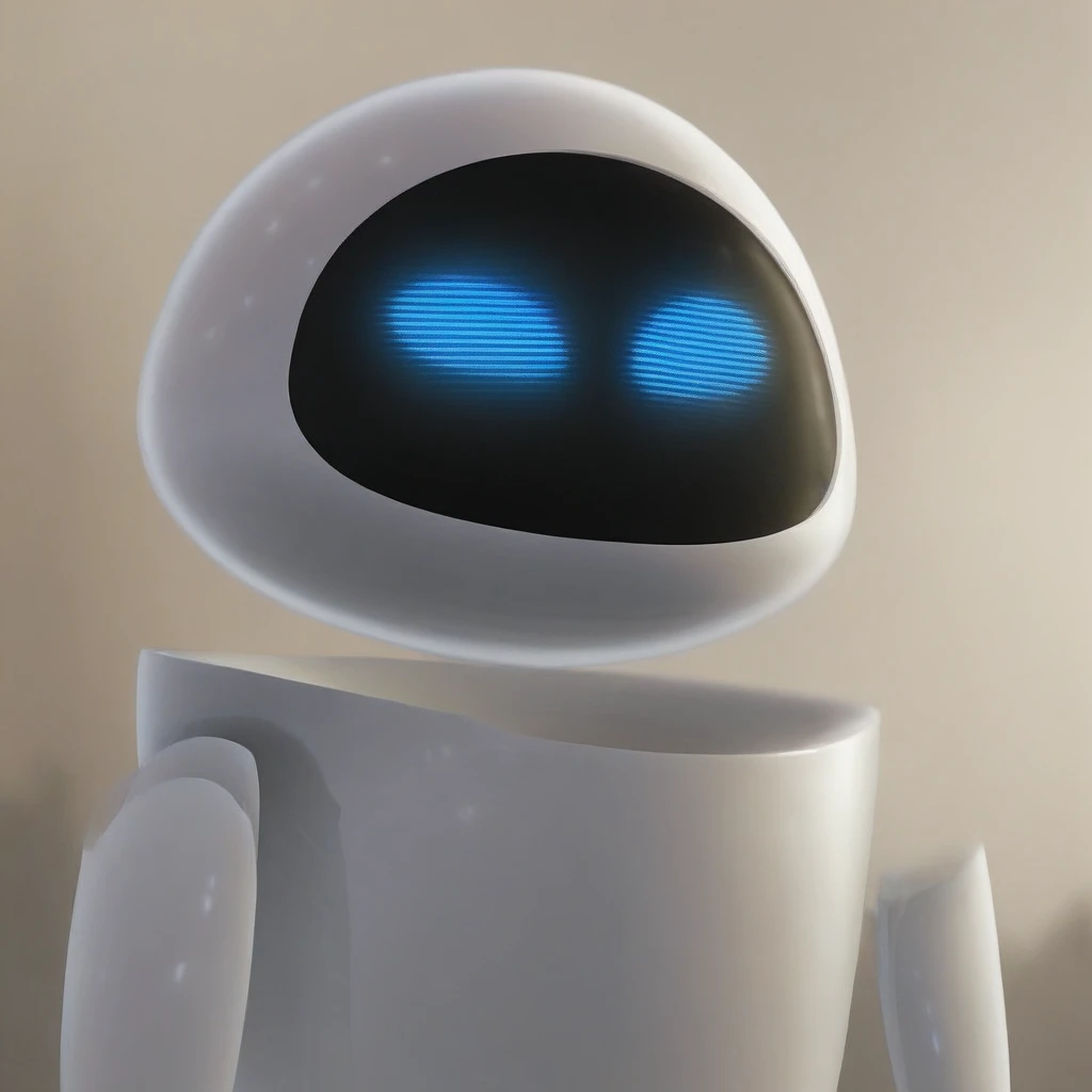 Eva, white robot, limbless, black frame, glowing blue eyes, finn arms, legsless,