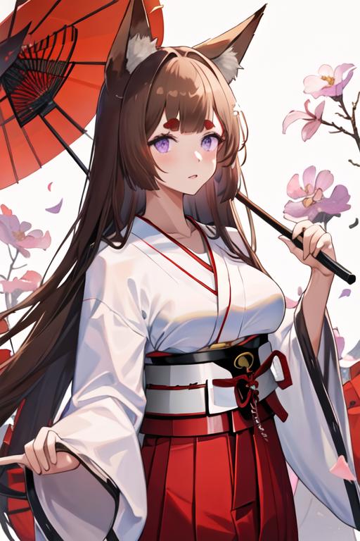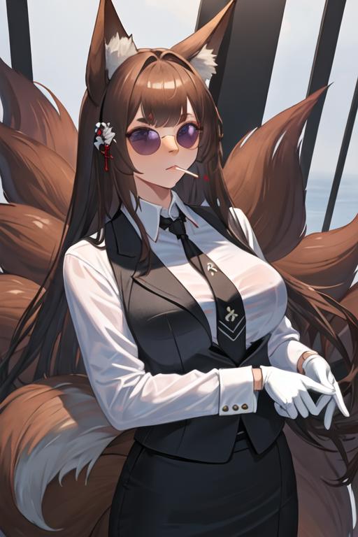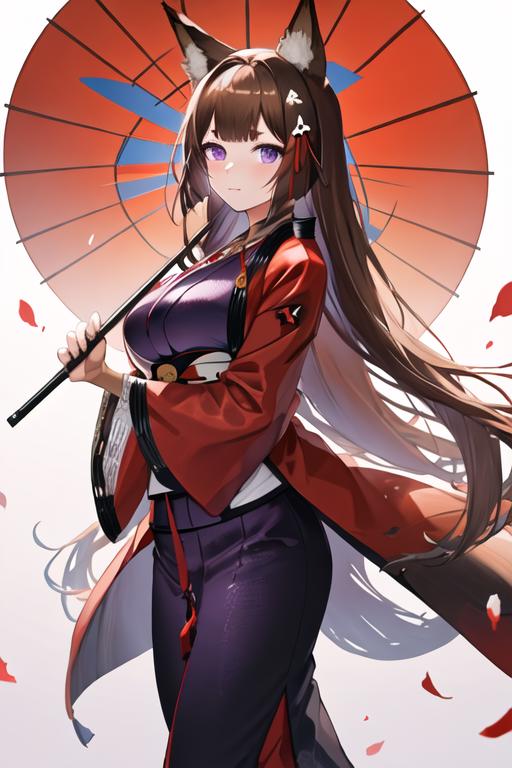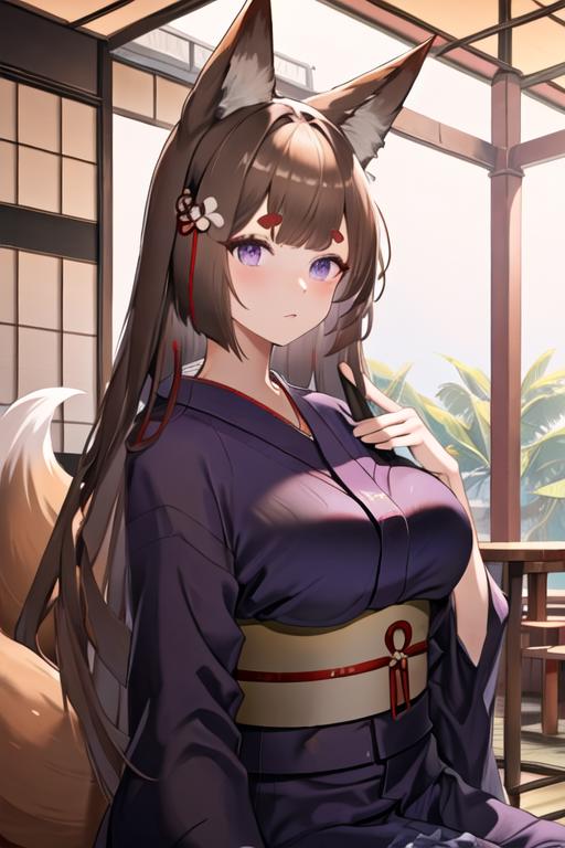 The trigger word is amagi_azurlane, and the recommended tags are best quality, masterpiece, highres, solo, {amagi_azurlane:1.15}, animal_ears, fox_ears, brown_hair, long_hair, purple_eyes, bangs, thick_eyebrows, breasts, large_breasts, animal_ear_fluff, hair_ornament, blunt_bangs, tail, fox_girl.