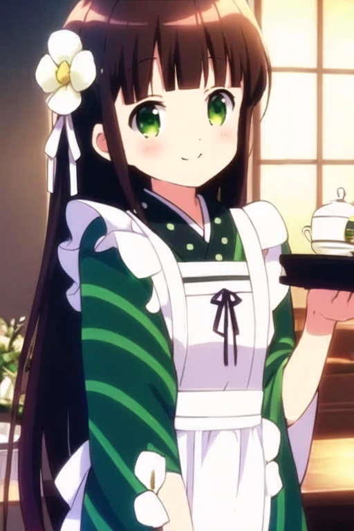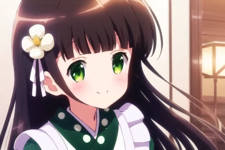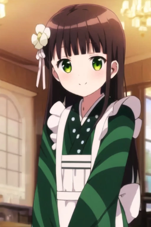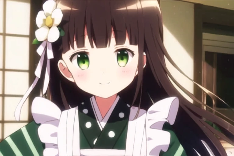 <lora:dtchiyabetav1:1>,1girl,ujimatsu chiya,chiya,is the order a rabbit,looking at viewer,long hair,brown hair,blunt bangs,hair flower,white flower,hair ribbon,white ribbon,green eyes,green kimono,striped kimono,wide sleeves,frilled white apron,maid apron,waitress,cafe,apron,bangs,blunt bangs,brown hair,depth of field,flower,green eyes,green kimono,hair ornament,japanese clothes,kimono,portrait,ribbon,solo,striped kimono,white apron,gan rabbit nunnery,blush,light_blush,