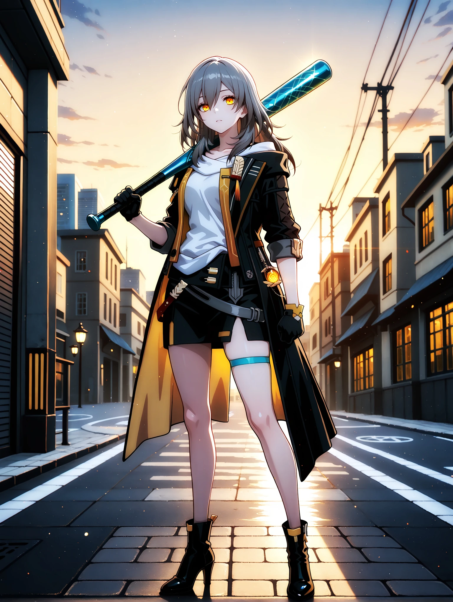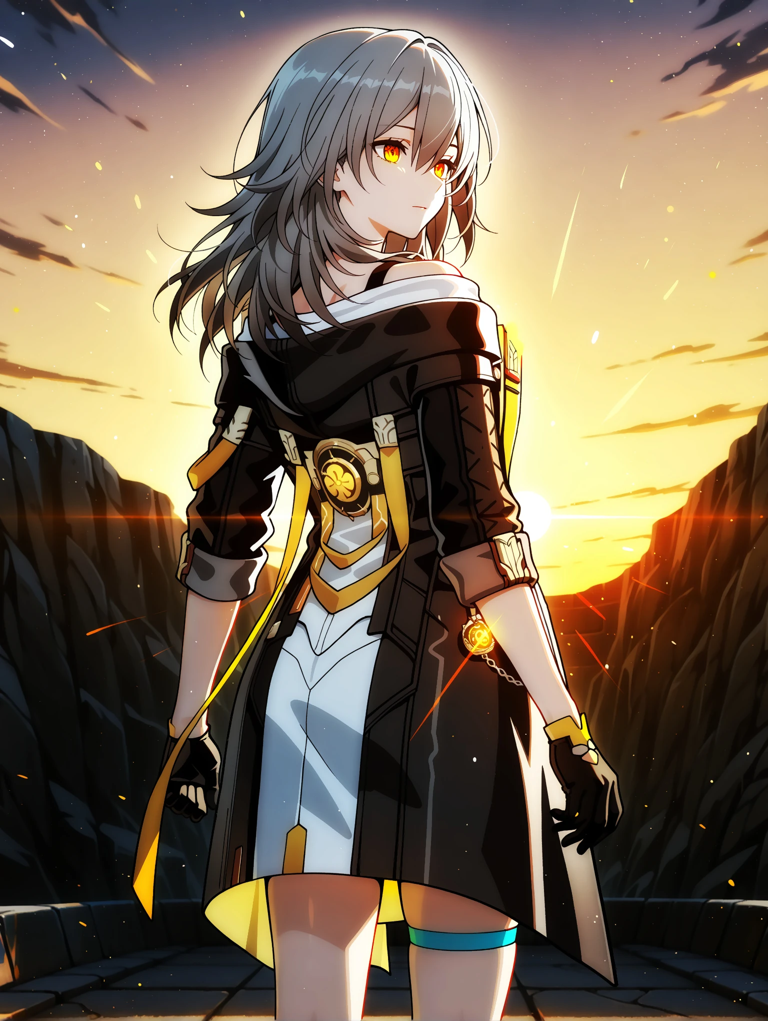 Outfit Prompts : jacket, off shoulder, gloves, black gloves, single thigh strap, hood, black footwear, boots, high heels