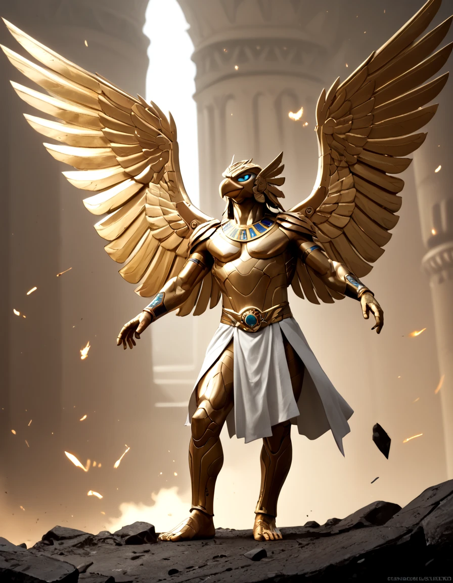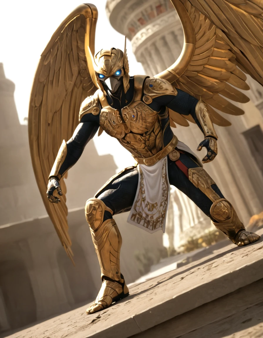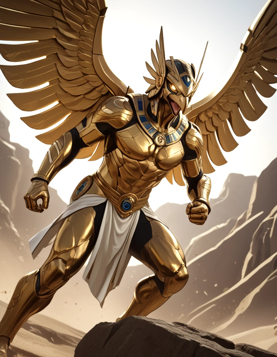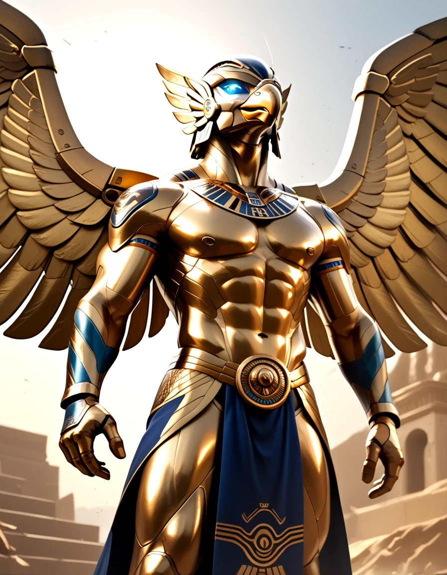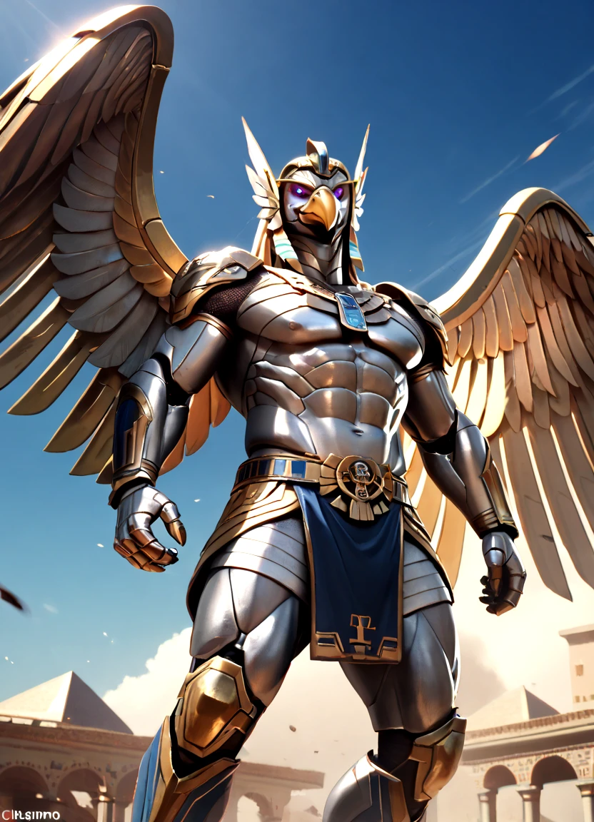 The prompts for this lora are horus, gold, silver, metal skin, golden silver metal skin, golden metal skin, silver metal skin, wings, muscular, armor, mech, mecha, robot, Egyptian, fighting, battle, and dynamic action. There were others used to train this lora, yet I posted the ones common for most. I also used temple, city, palace, garden, destroyed temple, destroyed city, destroyed palace, and monumental architecture.