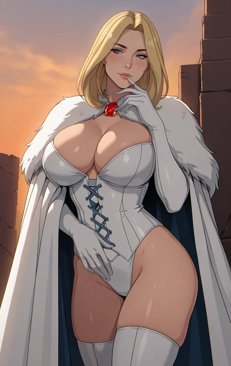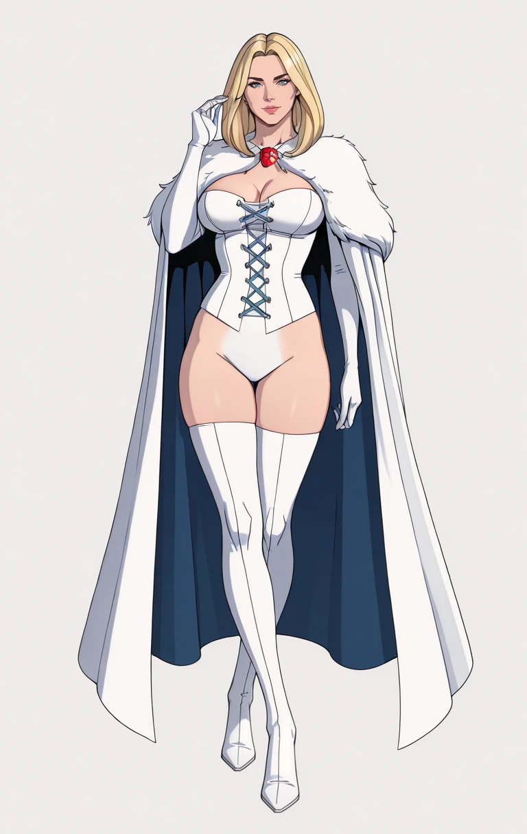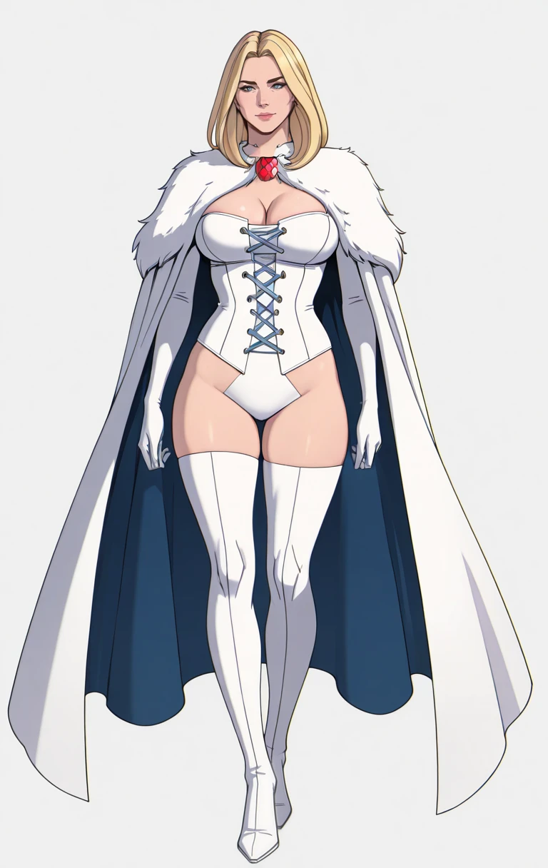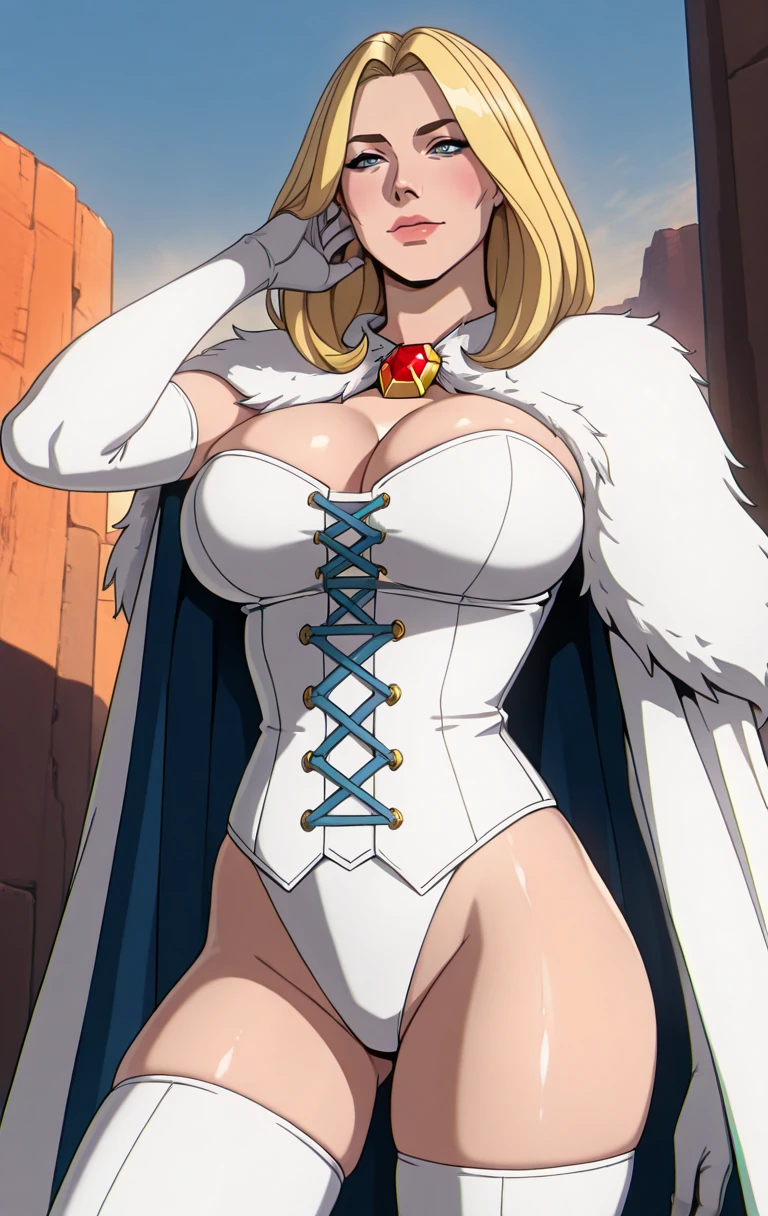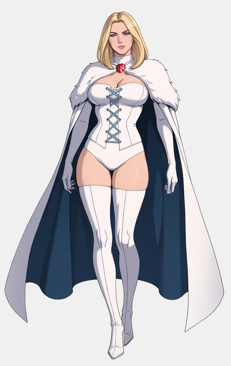 emm4fr0st, 1girl, solo, blonde hair, thighhighs, gloves, , blue eyes, cape, elbow gloves, white gloves,