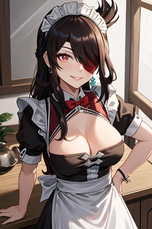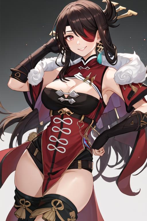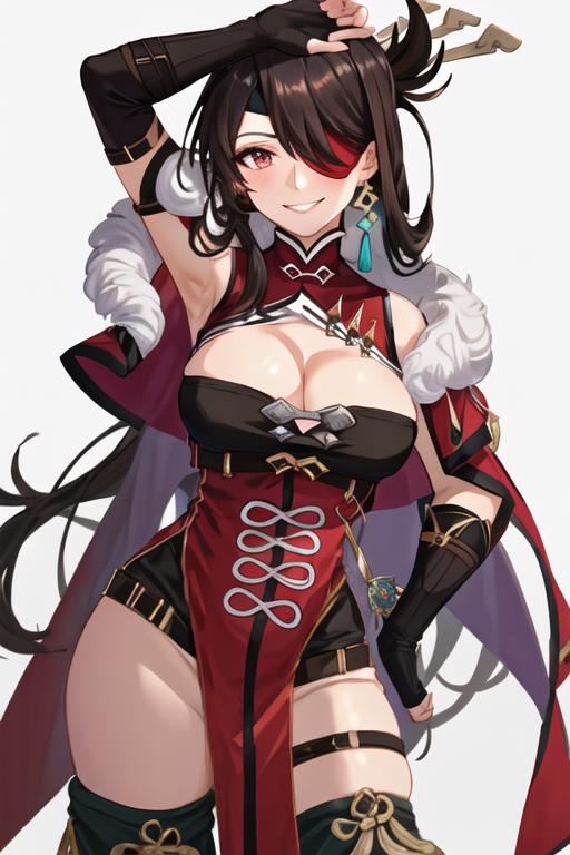 The trigger word is beidou_genshin, and the recommended tags are best quality, masterpiece, highres, solo, {beidou_genshin:1.15}, long_hair, eyepatch, red_eyes, brown_hair, hair_ornament, hair_over_one_eye, breasts, one_eye_covered, hairpin, smile, hair_stick, jewelry, bangs, earrings, large_breasts, cleavage.