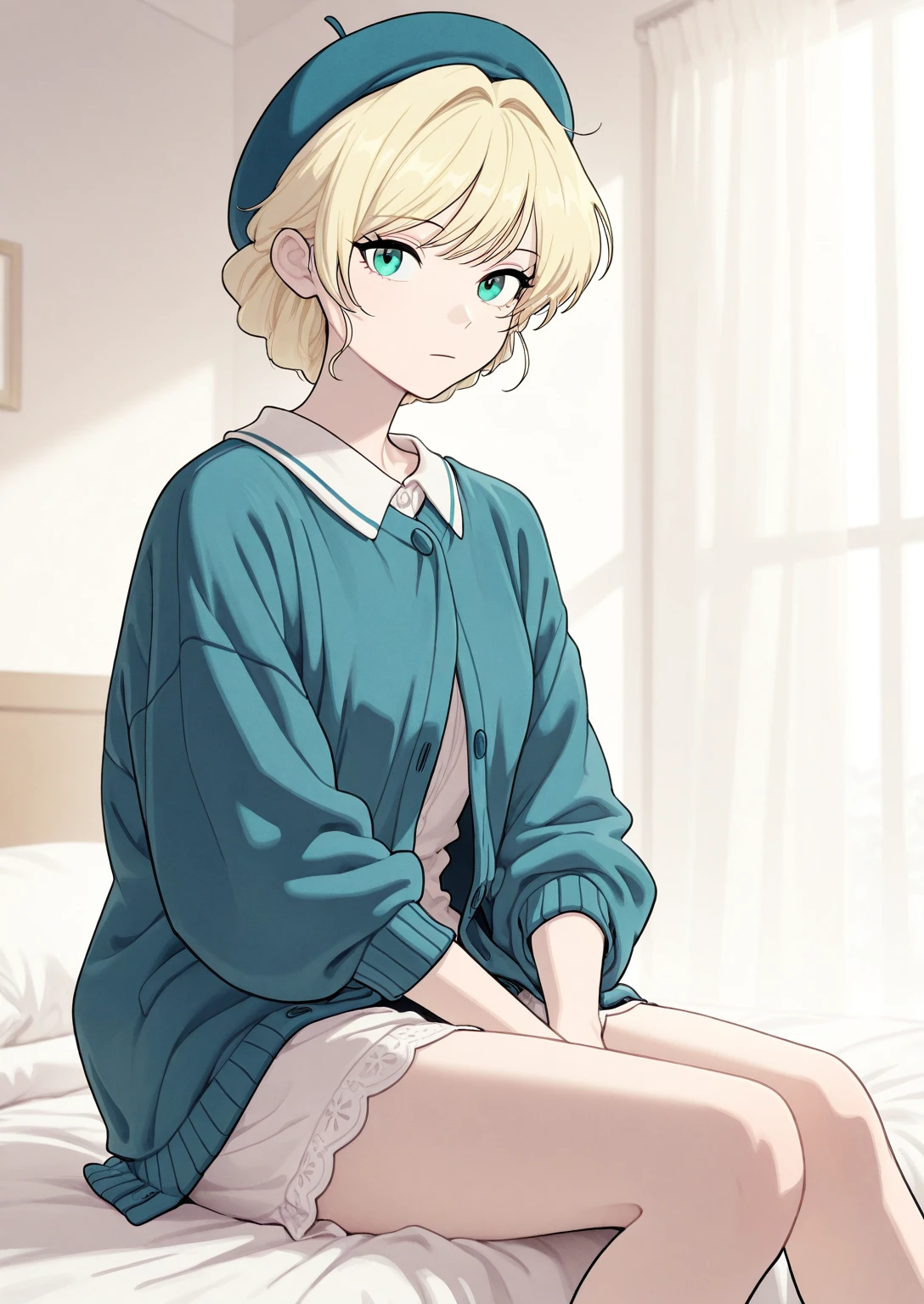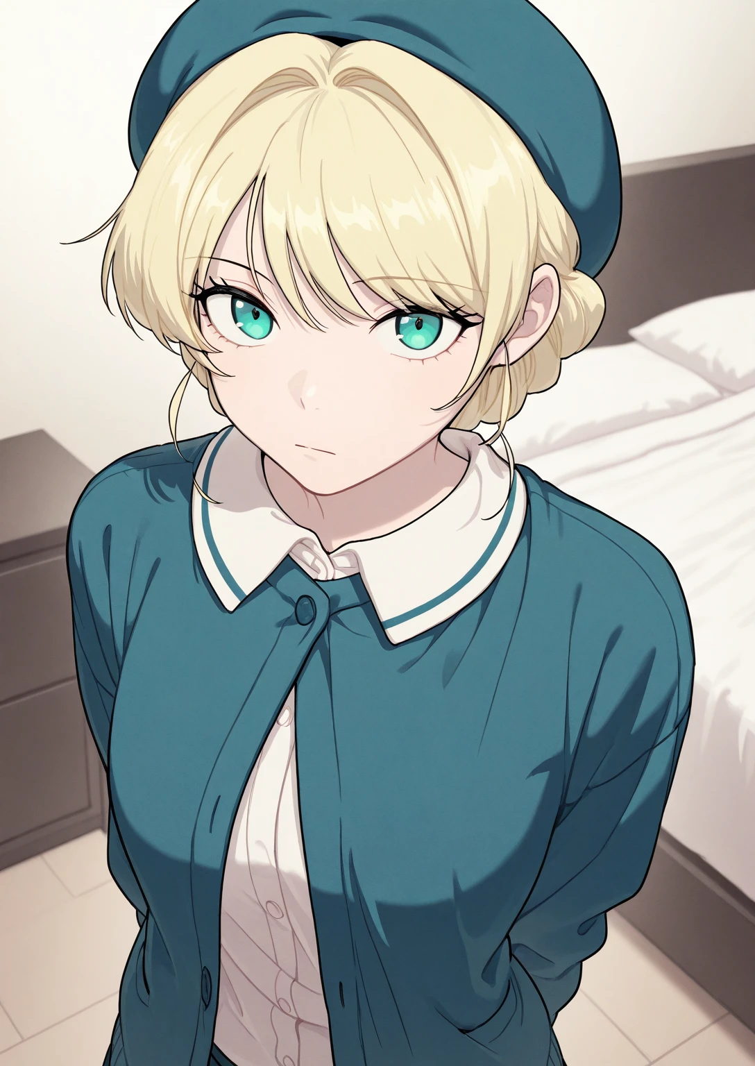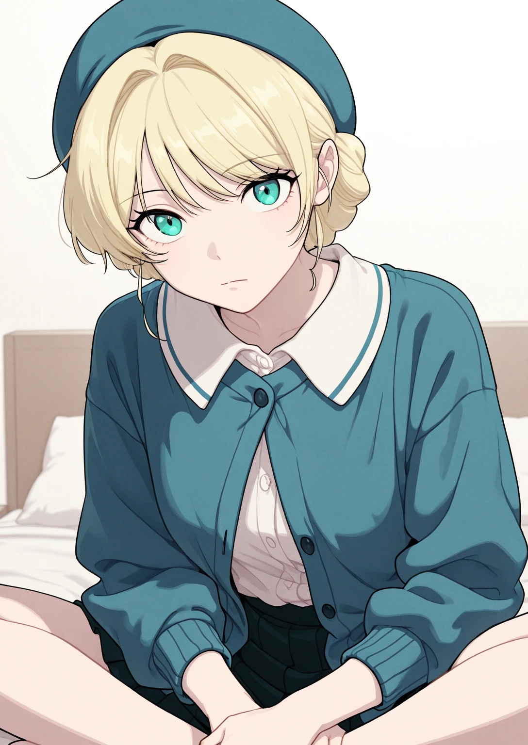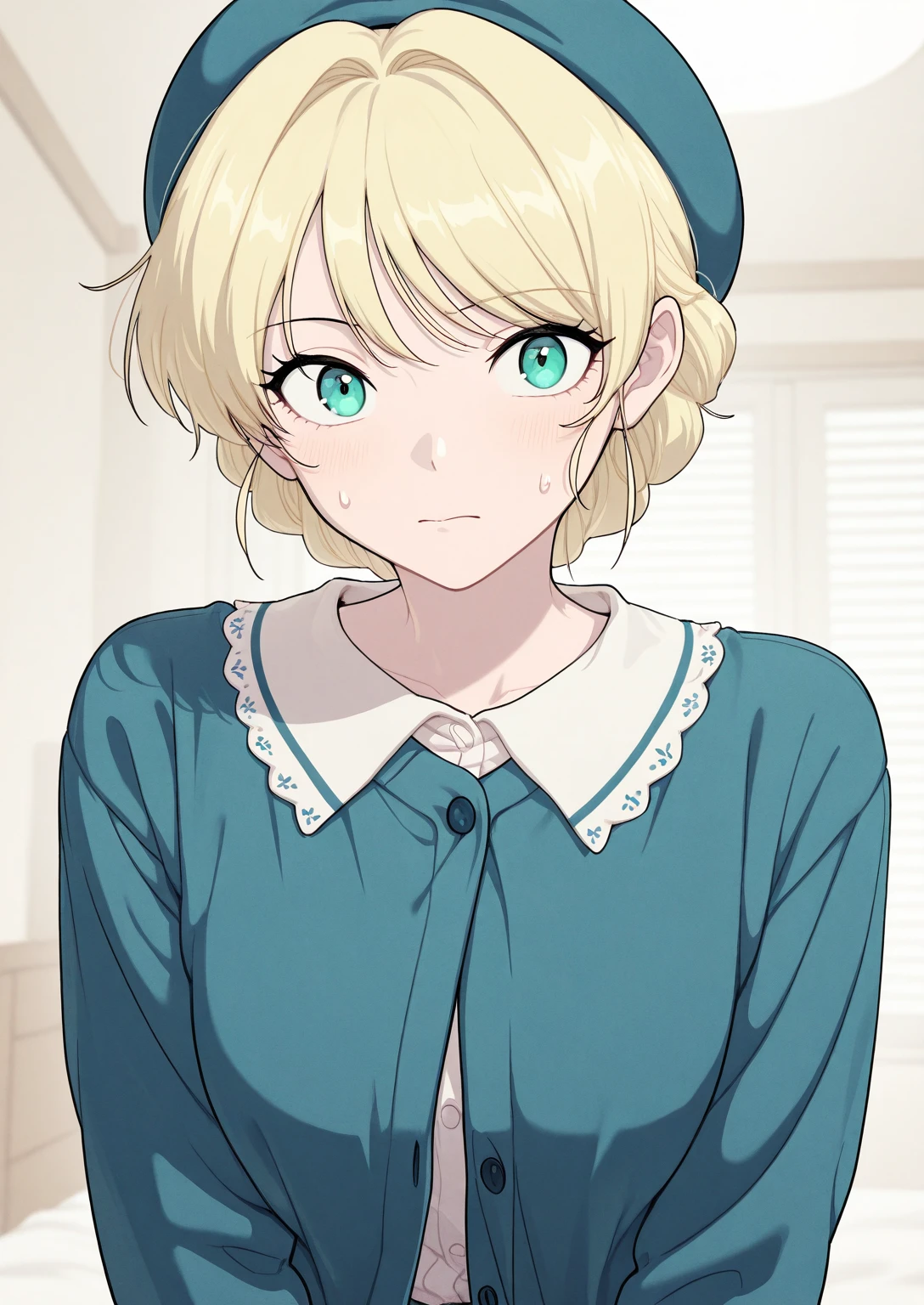 blue cardigan, long sleeves, white collar, white shirt, blue beret, hat,