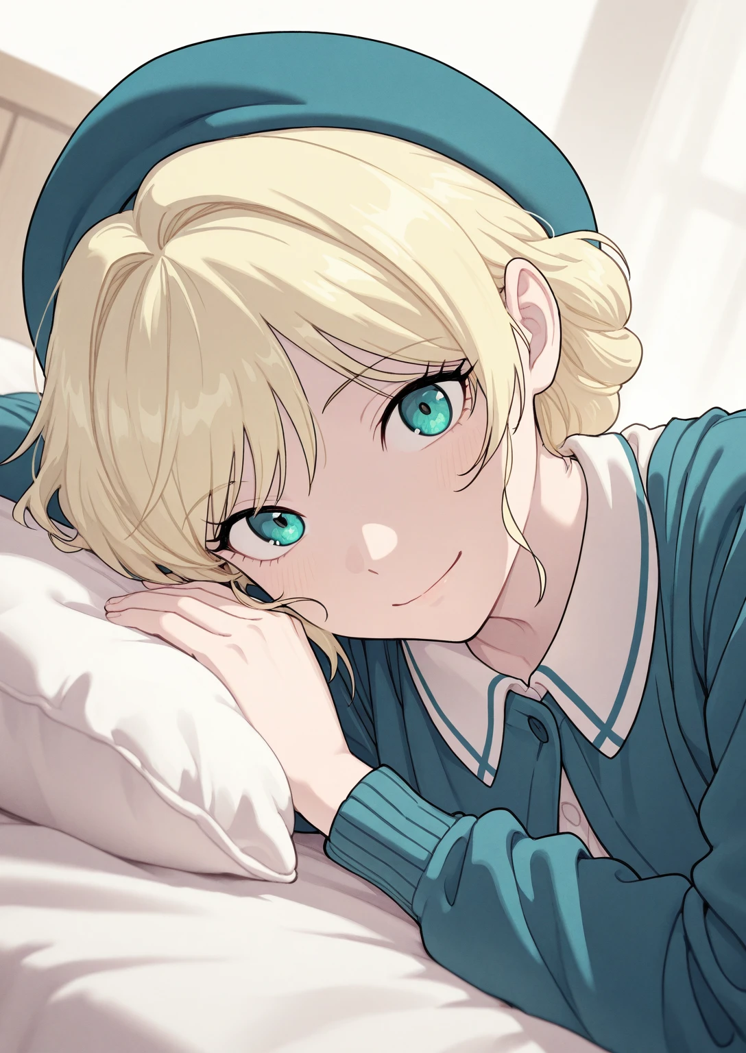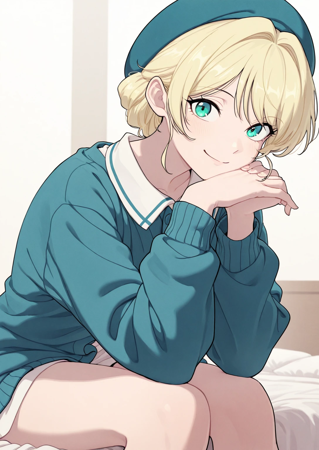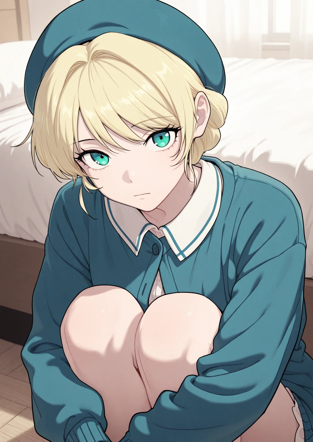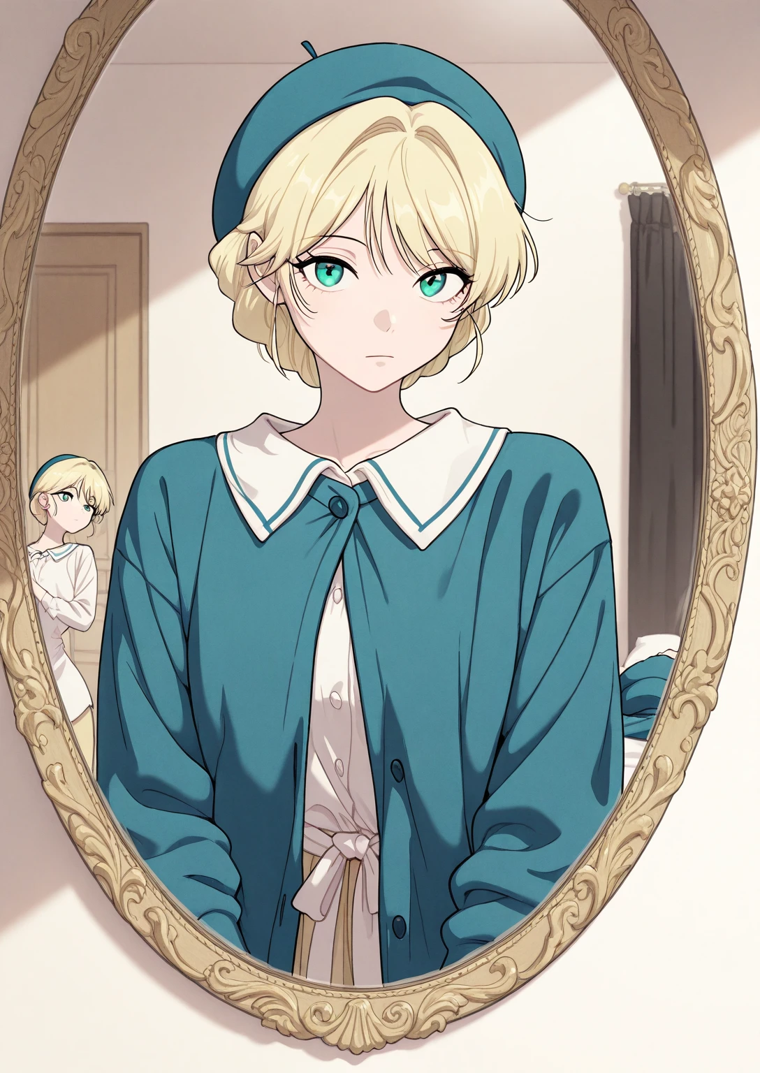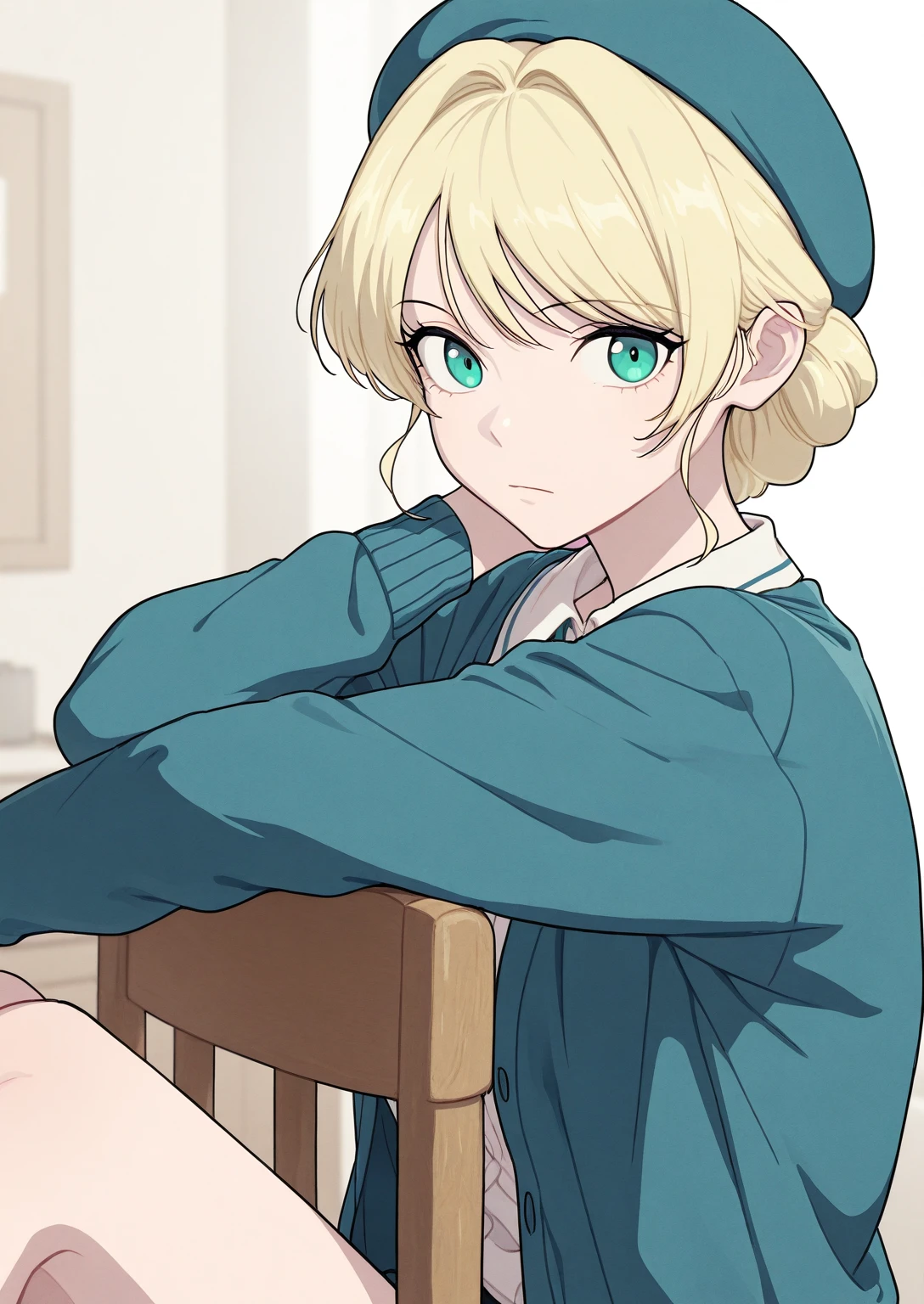 blue cardigan, long sleeves, white collar, white shirt, blue beret, hat,