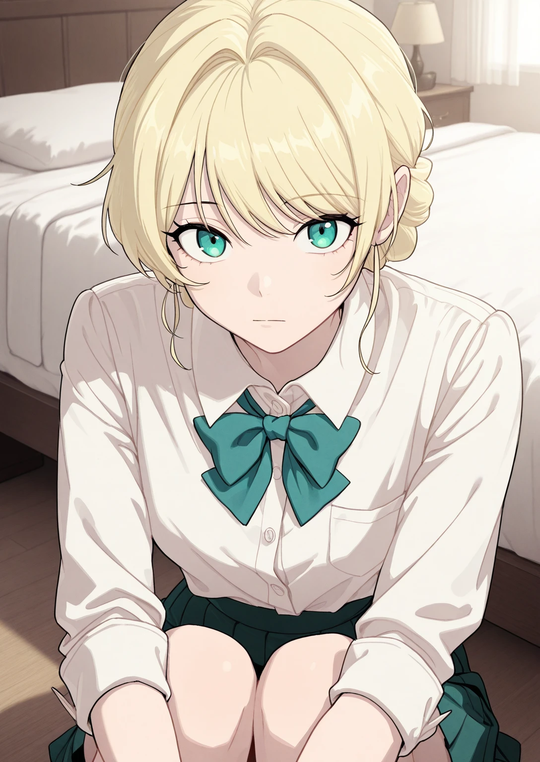 white shirt, button-up shirt, long sleeves, rolled-up sleeves, white collar, teal bow, teal ribbon, large bowtie, neck ribbon, pleated skirt, dark green skirt, high-waist skirt,
