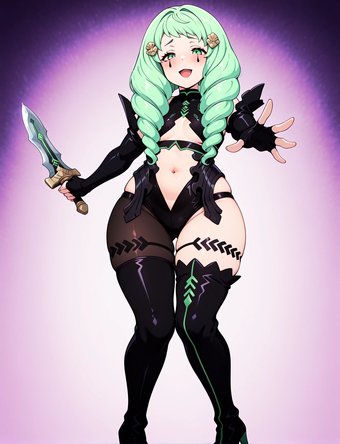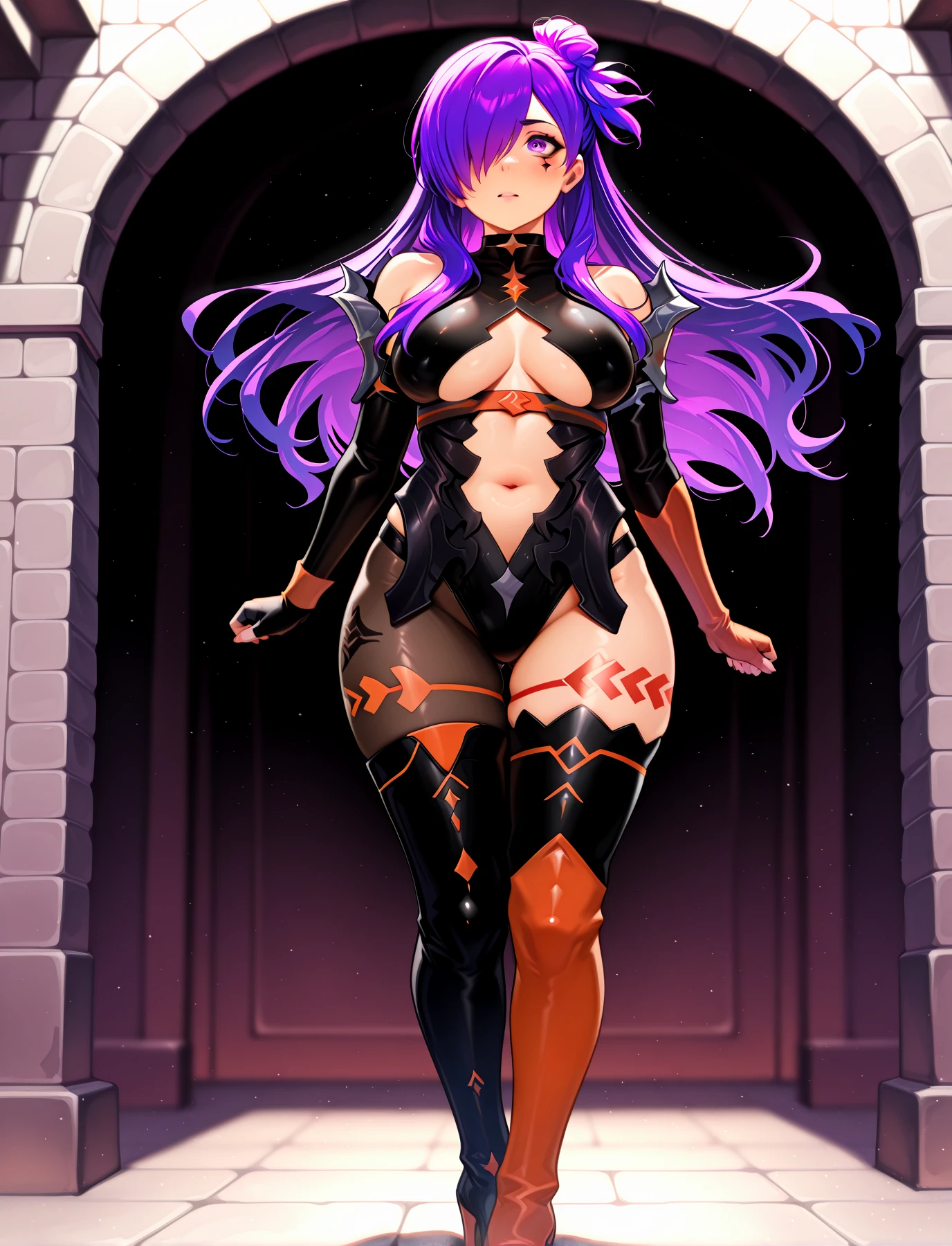 KronyaOutfit, tear facial mark, black eyeliner, black mascara, black revealing outfit, underboob, bare shoulders, fingerless elbow gloves, center opening, navel, clothing cutout, bodysuit, thigh tattoo, black thighhighs, asymmetrical legwear, single leg pantyhose, thigh boots, high heels,