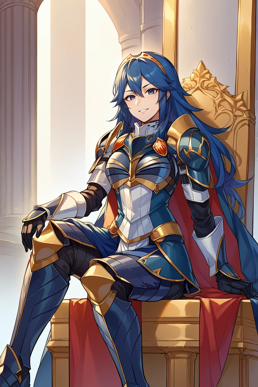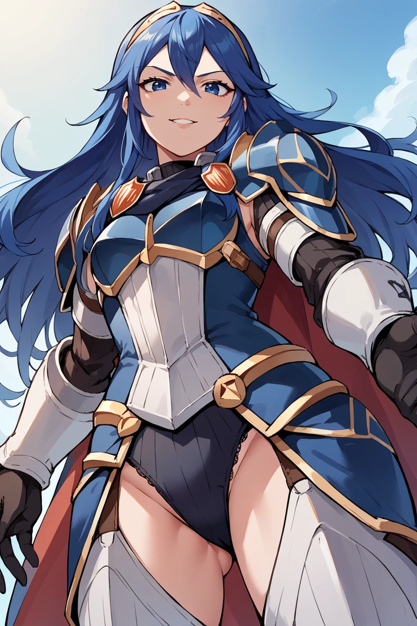 Add "rearmLuci, long hair, tiara, blue cape, full armor, blue armor, thighs, black panties, gloves" for Rearmed Lucina.