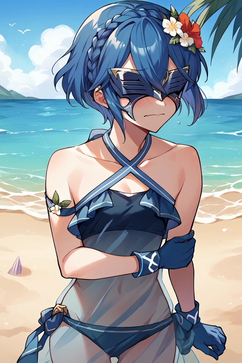 Add "sumLuci, short hair, braid, hair ornament, hair flower, mask, covered eyes, short hair, halterneck, bikini, see-through, blue gloves" for Summer Lucina.