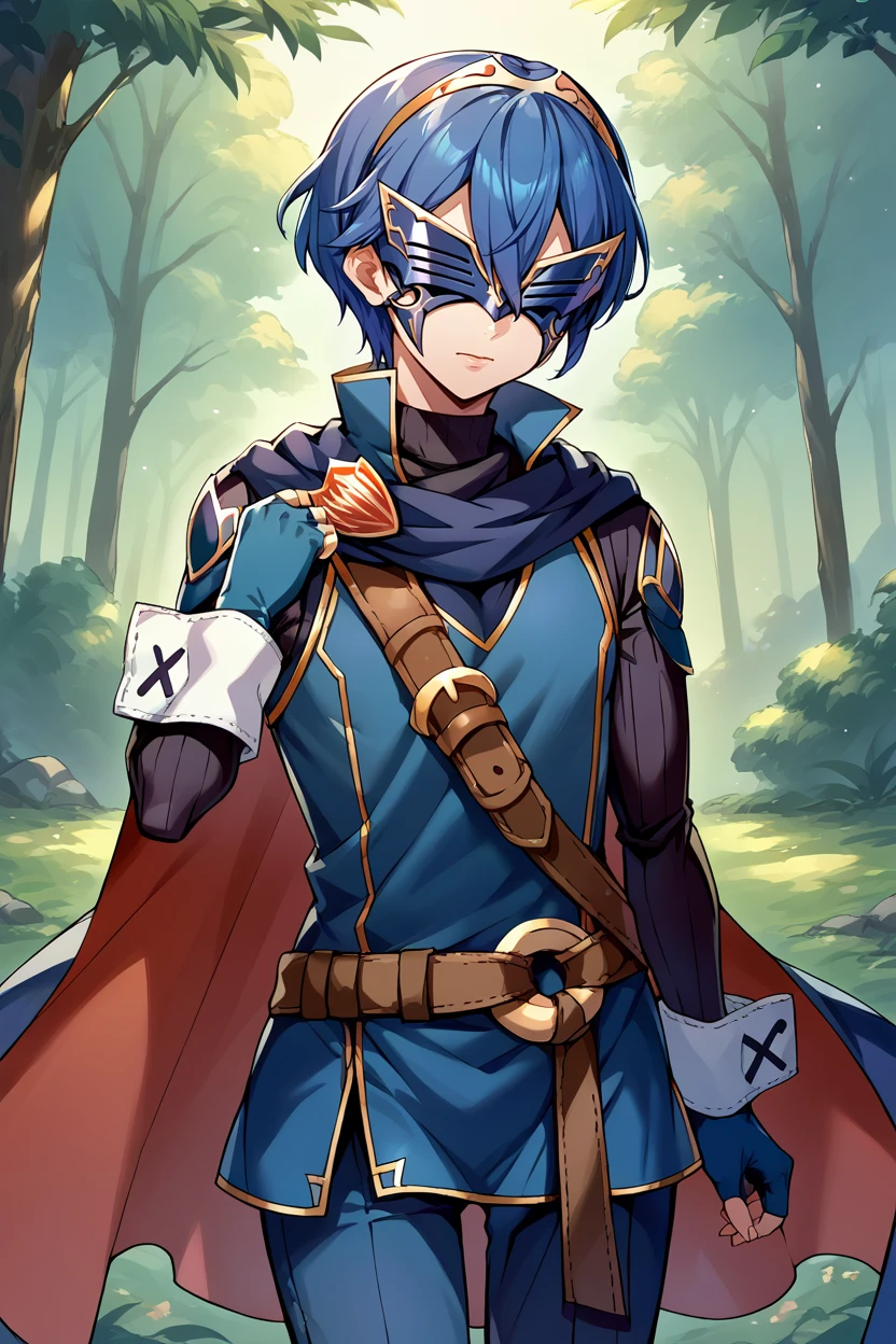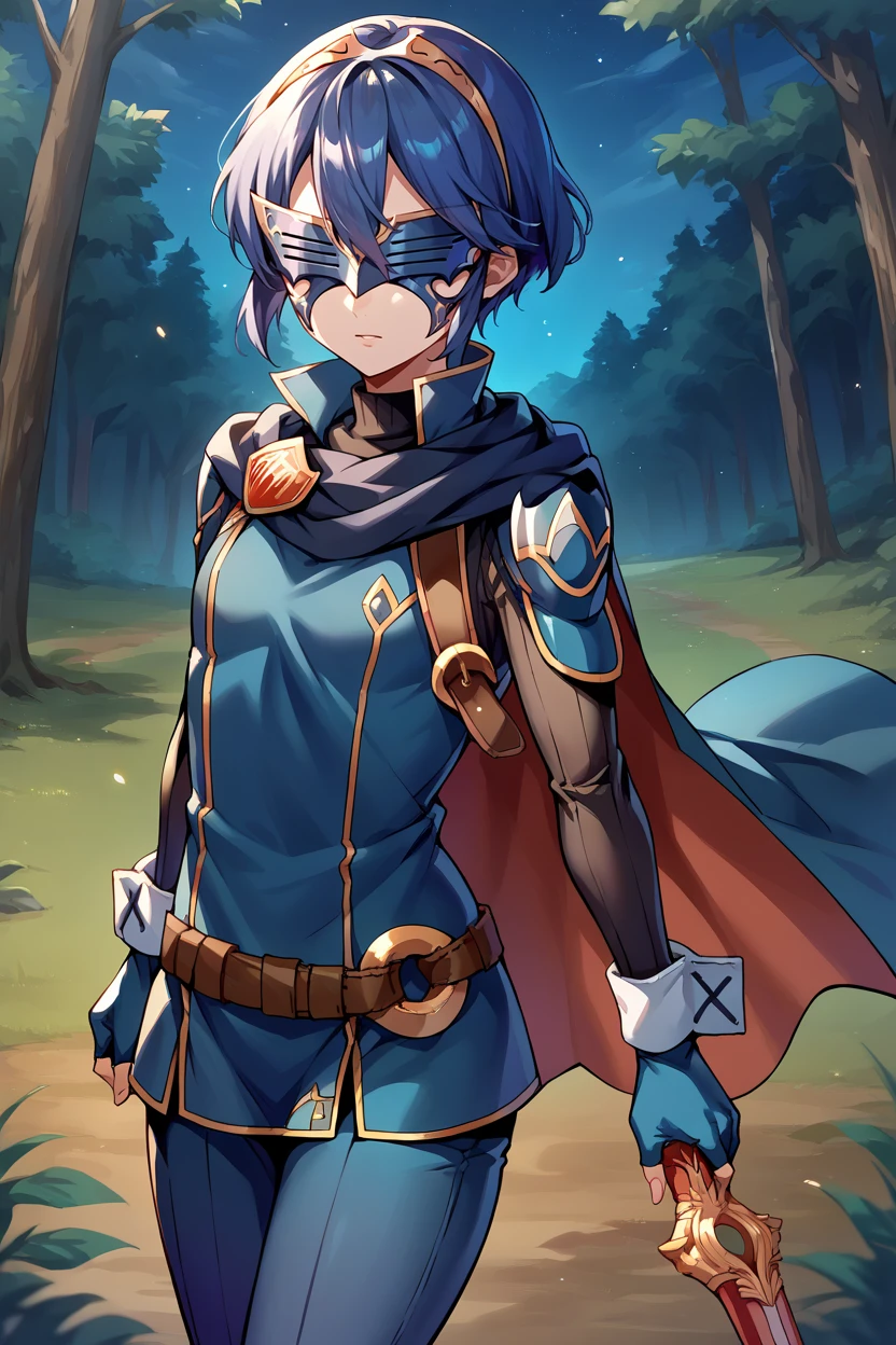 Add "defLuci, short hair, tiara, mask, covered eyes, cape, blue scarf, blue tunic, long sleeves, cuffs, fingerless gloves, belt, blue pants, thigh boots" for her masked appearance.