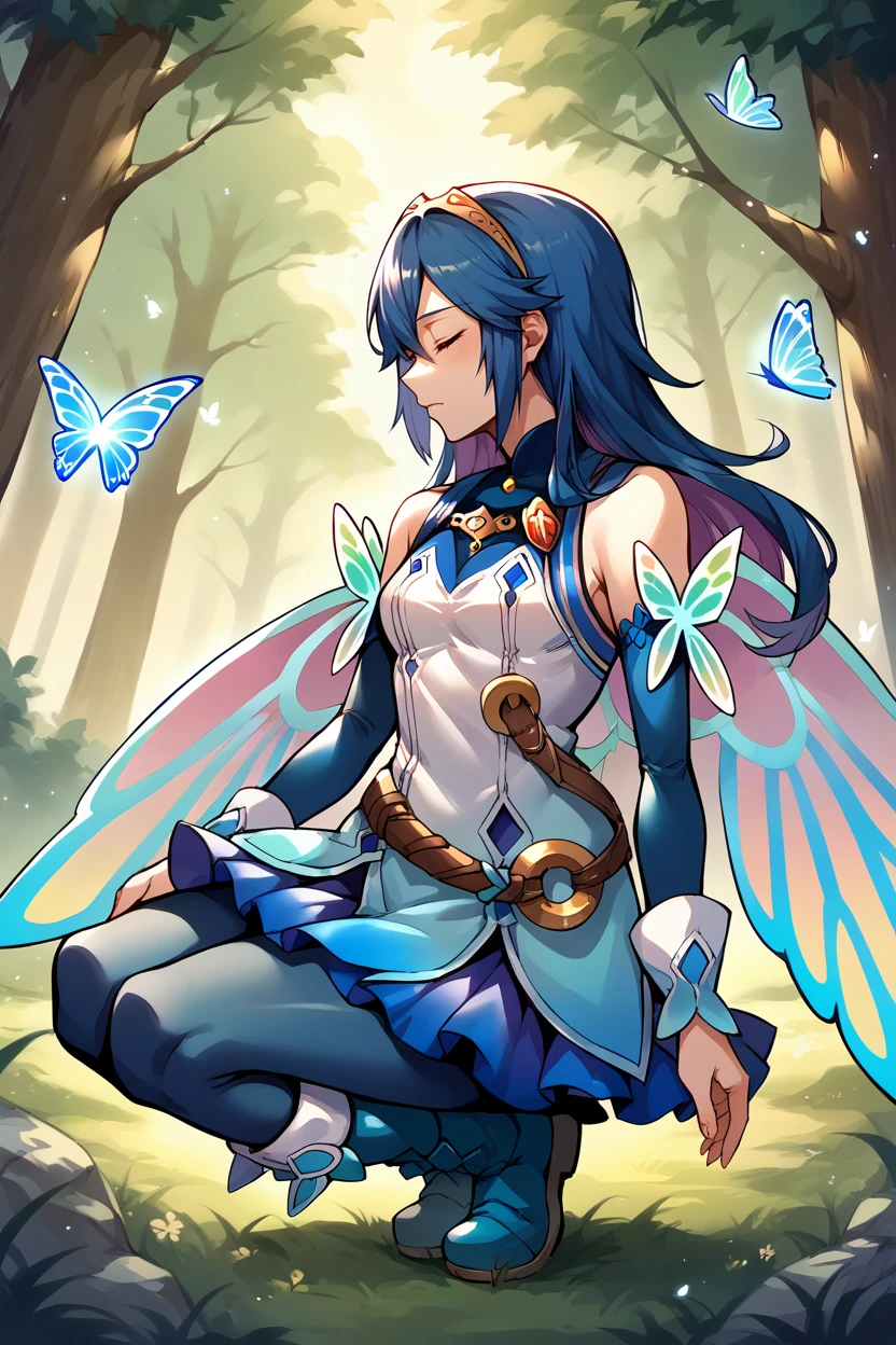 Add "respLuci, long hair, tiara, white shirt, butterfly wings, sleeveless, blue elbow gloves, blue skirt, pantyhose, blue boots" for Resplendent Lucina.