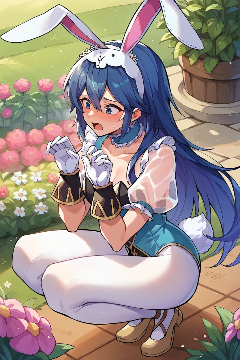 Add "sprLuci, long hair, fake rabbit ears, frilled choker, leotard, cleavage, frills, puffy sleeves, see-through, gloves, white leggings, tail" for Spring Lucina.