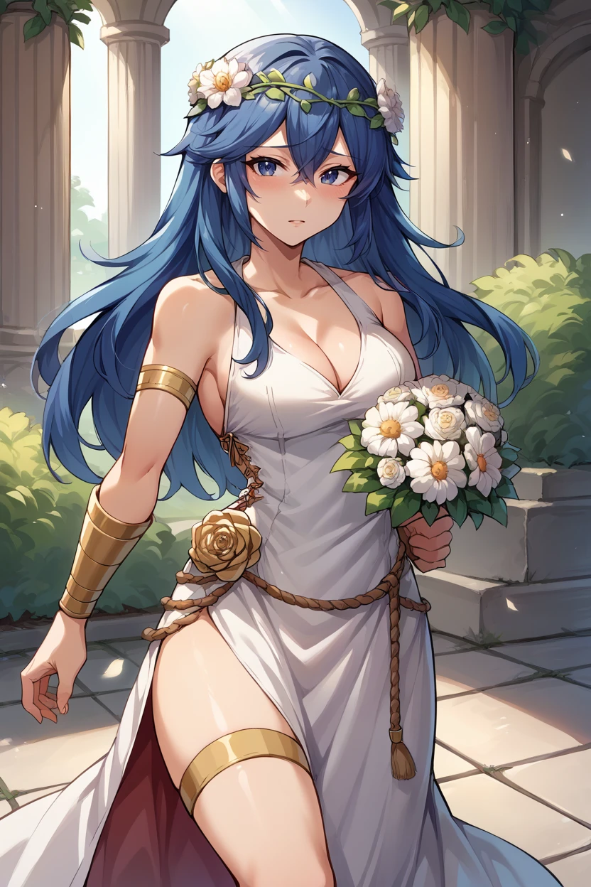 Add "valLuci, long hair, hair flower, sleeveless white dress, cleavage, bracer, armlet, rope, side slit, golden thigh strap" for Valentine's Lucina.