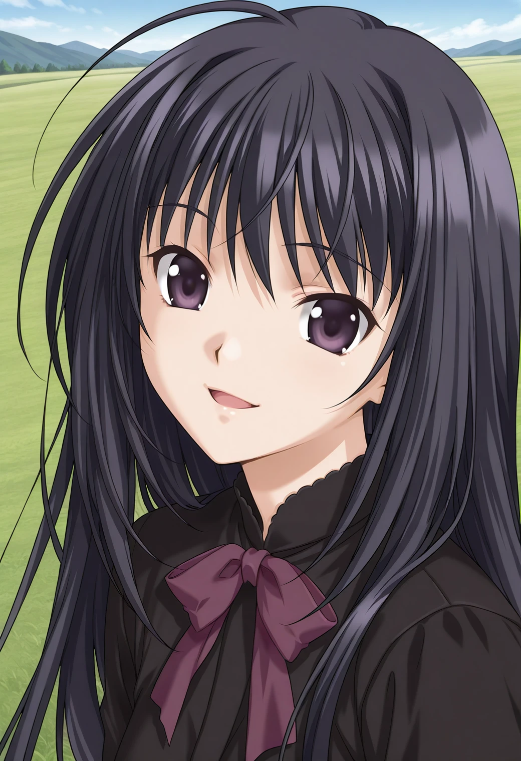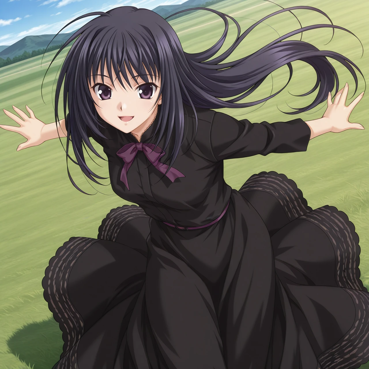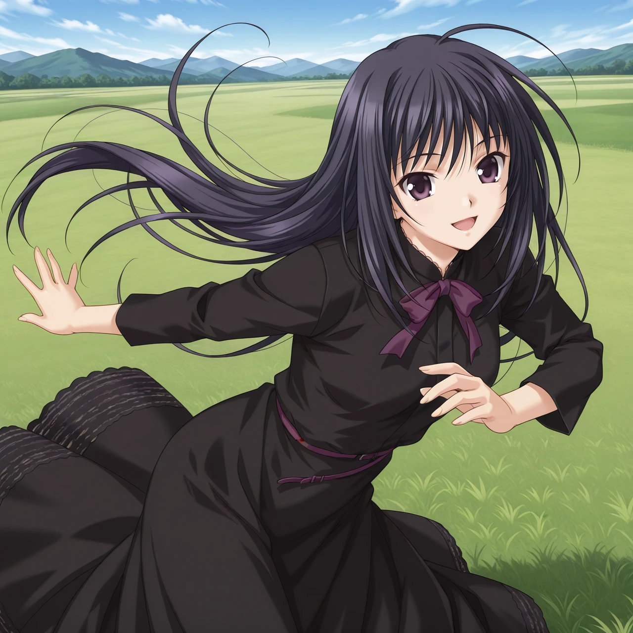 ever17_tugumi, purple eyes, black hair, long hair, ahoge, bowtie, black dress, long sleeves, long skirt,