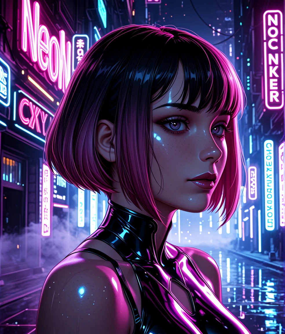 • OmniFusion, neon cyberpunk portrait of a woman with short hair, strong magenta and cyan rim lights, reflective surfaces, glossy highlights, dramatic contrast, neon signs, atmospheric fog, cinematic glow