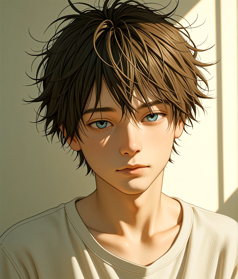 • OmniFusion, semi-realistic anime portrait of a teenage boy, expressive detailed eyes, balanced studio lighting, soft shading, pastel accents, crisp lineart, subtle glow, smooth 2.5D transitions