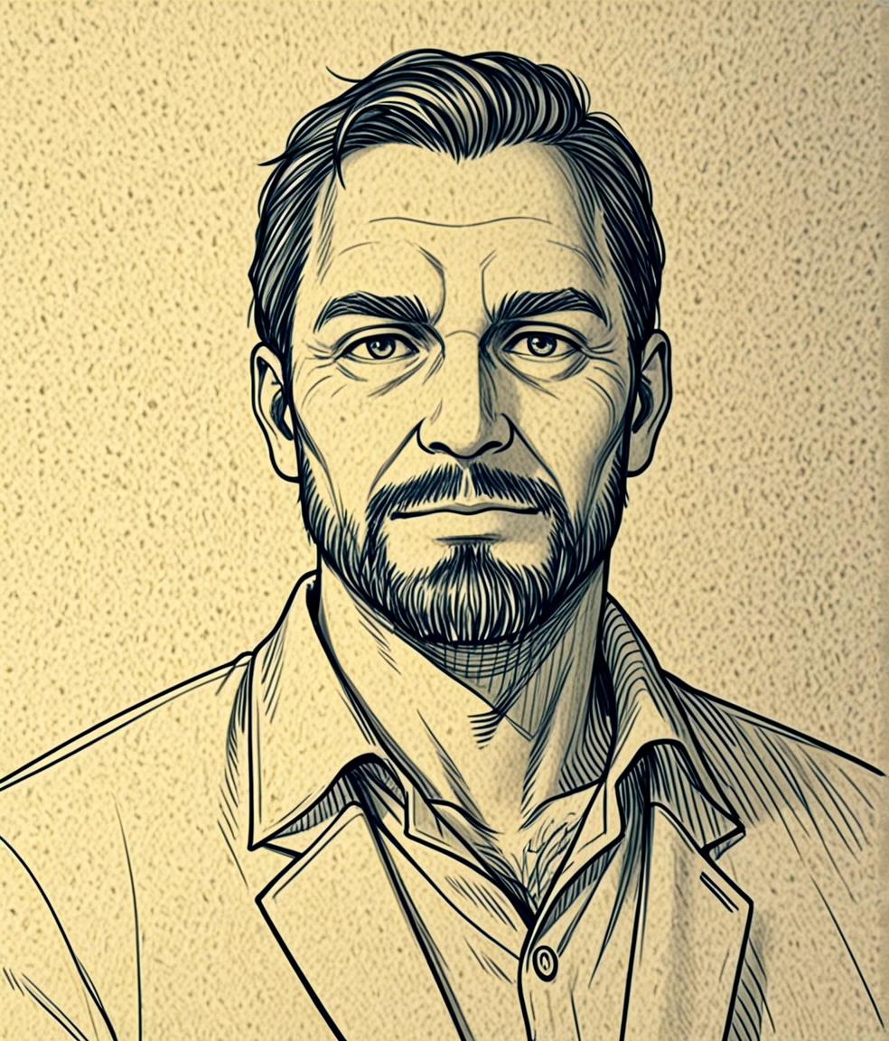 • OmniFusion, graphite pencil sketch portrait of a mature man, clean strokes, soft cross-hatching, subtle shading, natural paper texture, monochrome aesthetic, soft top lighting