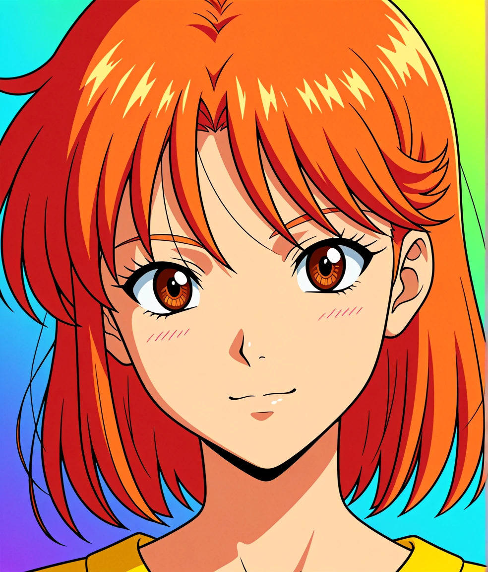 • OmniFusion, pure anime style portrait, full color anime, vibrant anime palette, sharp clean lineart, flat cel shading, large expressive eyes, simple gradients, soft ambient light