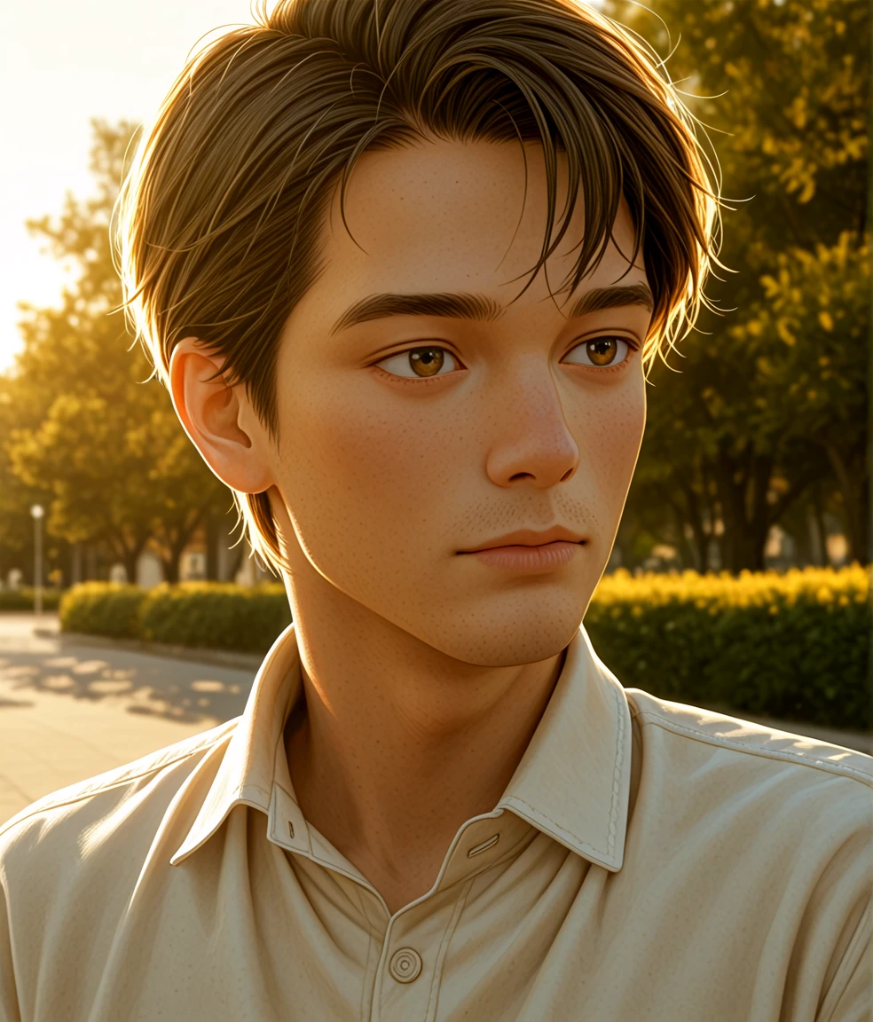 • OmniFusion, fashion editorial portrait of a male model during golden hour, warm diffused light, crisp details, natural skin texture, shallow depth of field, premium color grading, cinematic vibe
