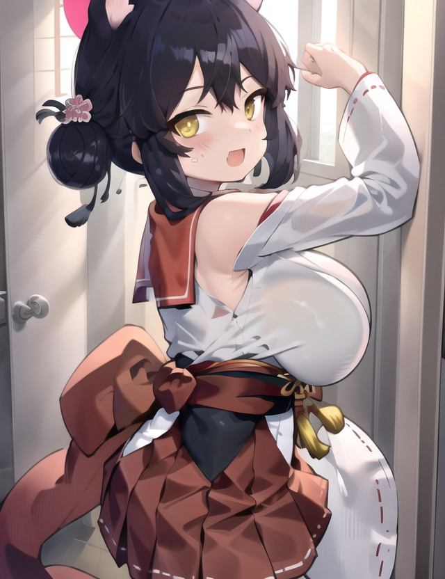 <lora:isamikaedeV010:0.8>, yellow_eyes, large_breasts, double_bun, animal_ears, hair_bun, black_hair