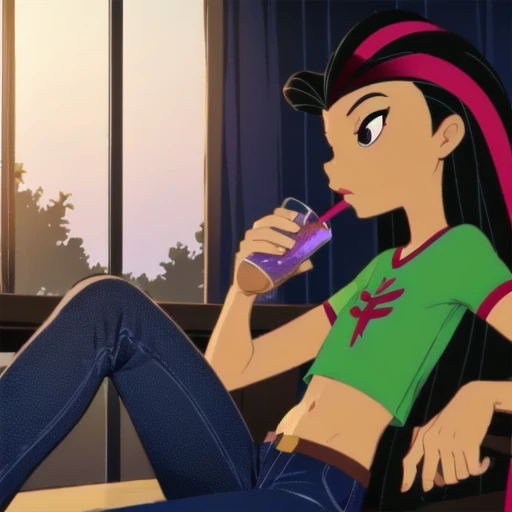 Default outfit: 1girl, long hair, shirt, black hair, multicolored hair, pants, denim, jeans, green shirt