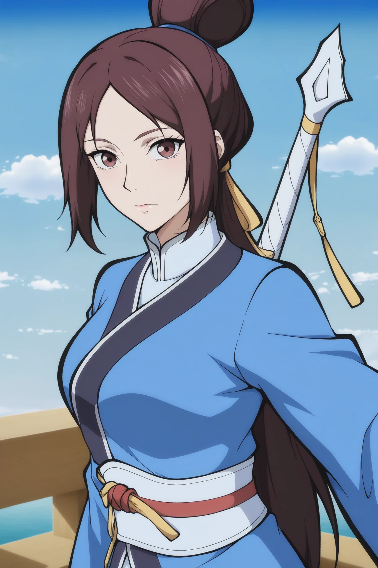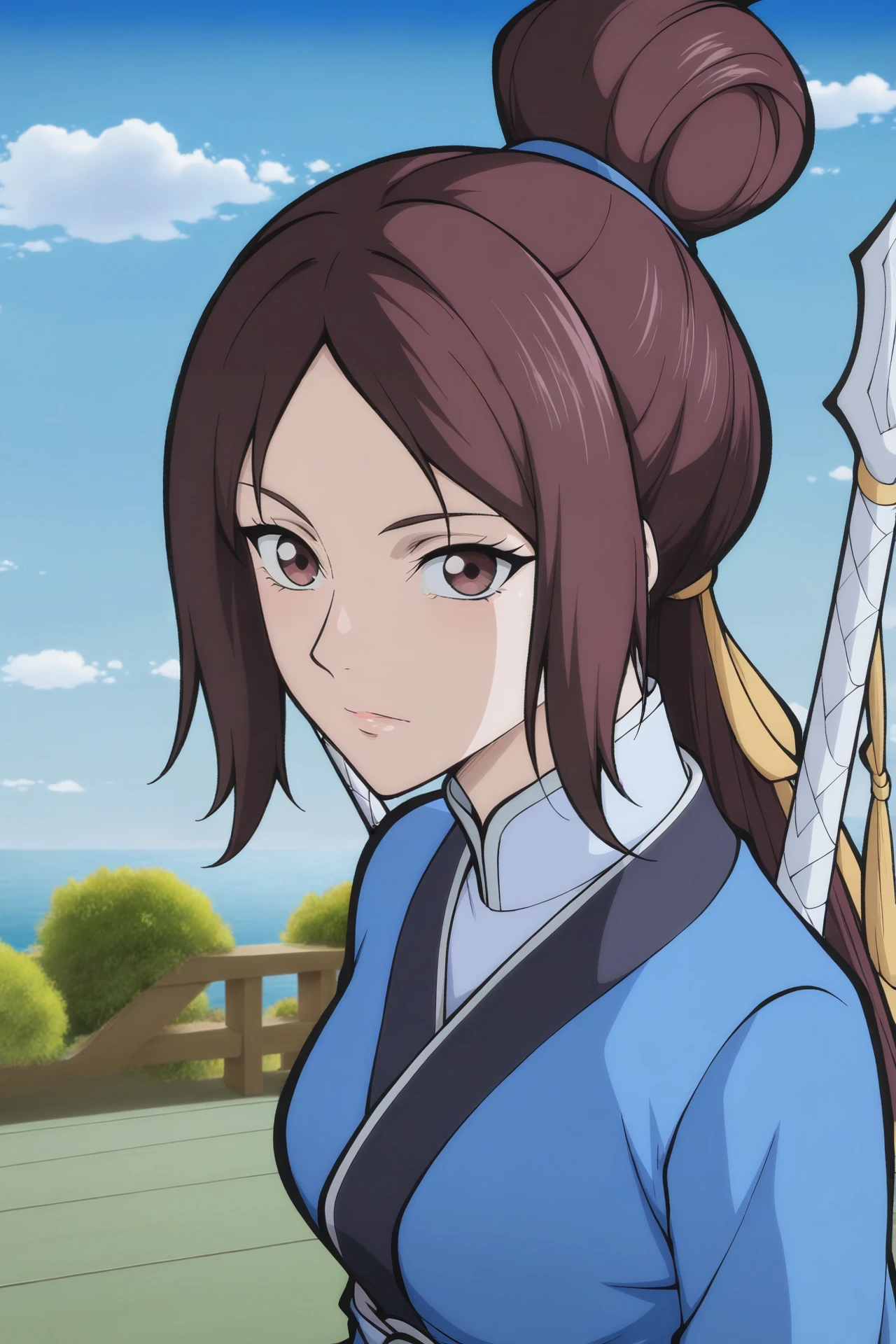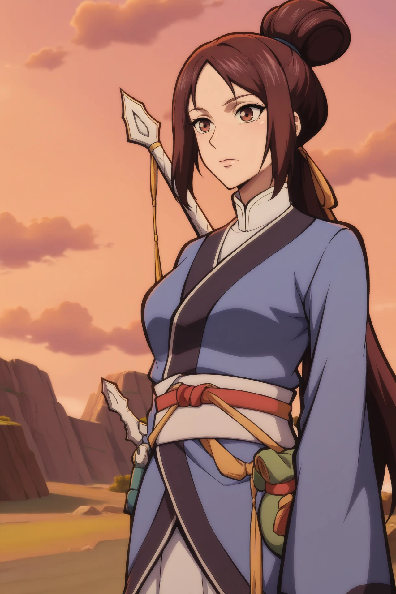 qianshijie,1girl,solo,brown hair,brown eyes,hair bun,ponytail