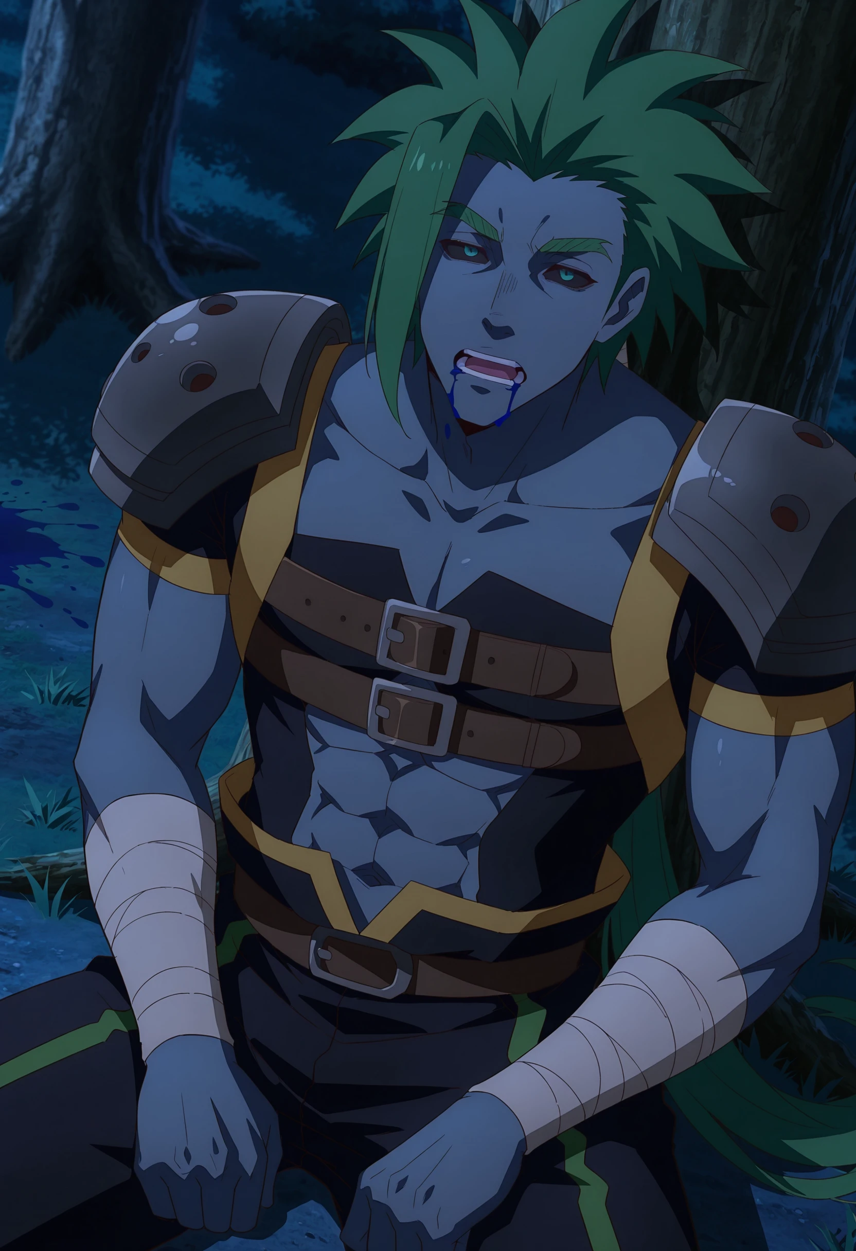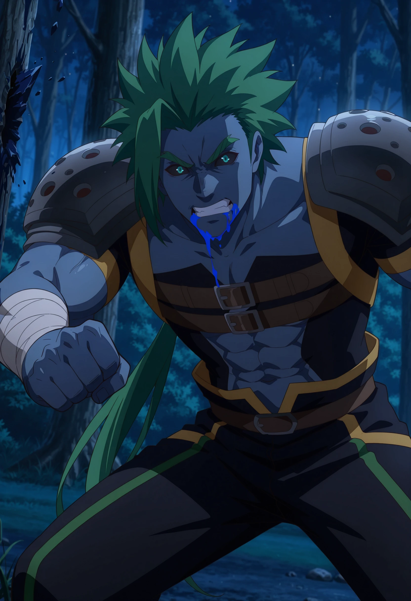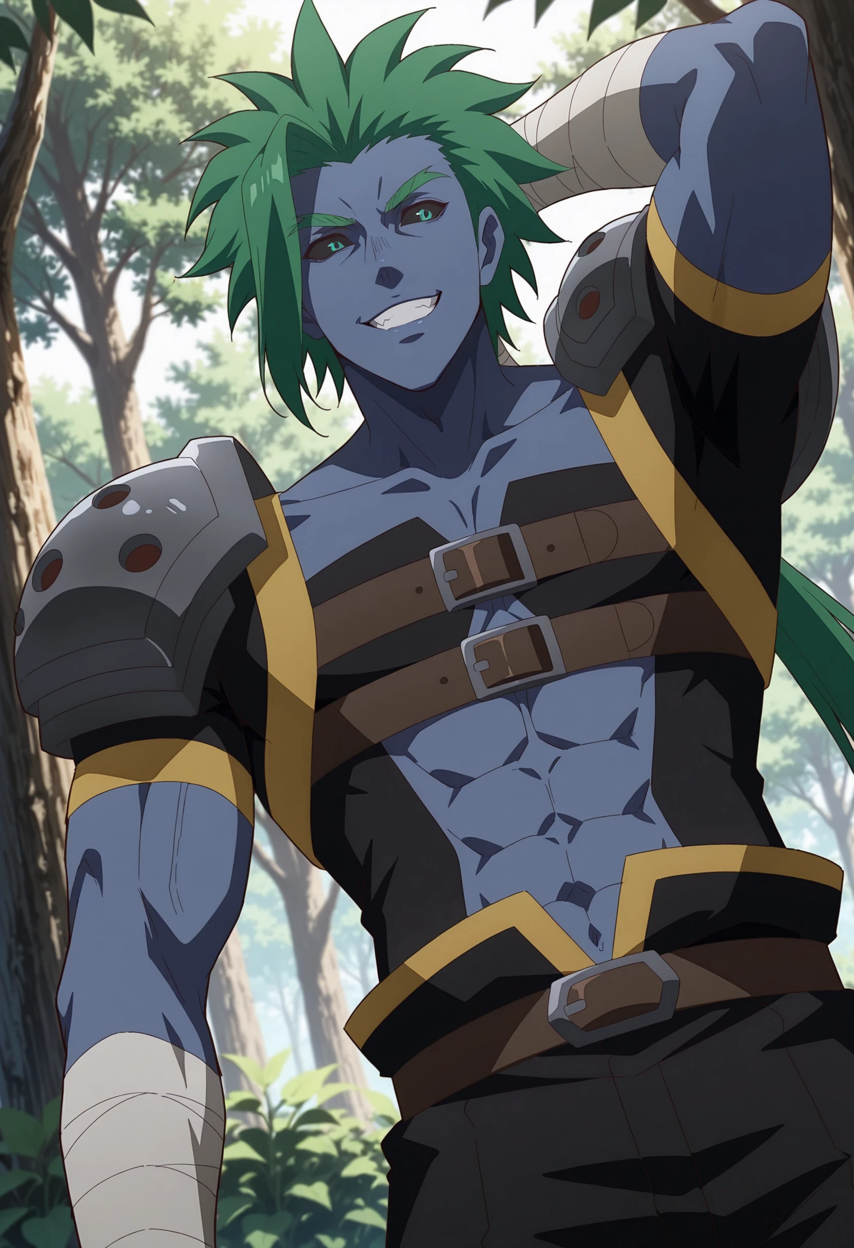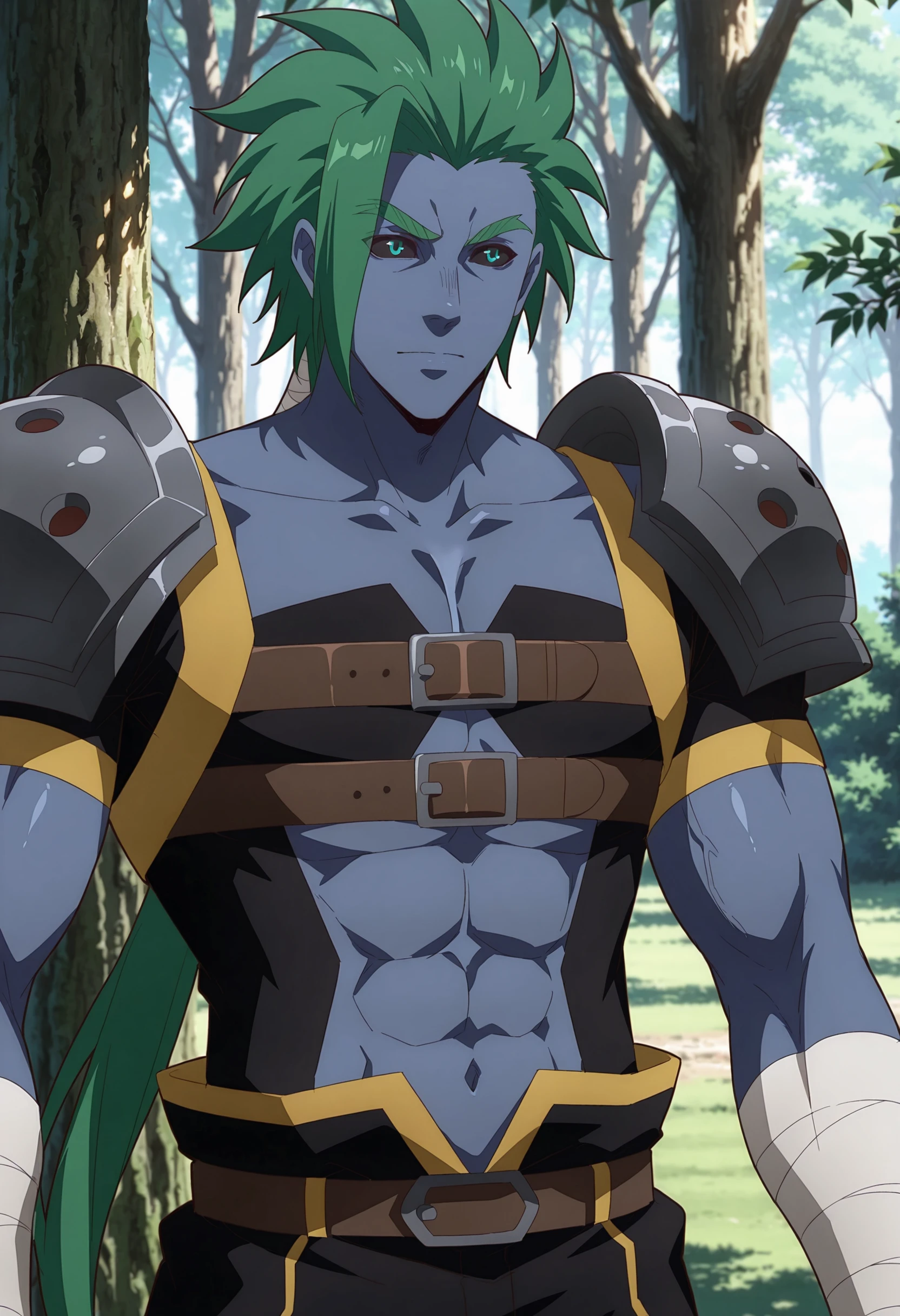 blue skin, black sclera, long green ponytail, black and yellow armor, brown straps on chest, shoulder armor with hole, bandages on forearms, bare abs