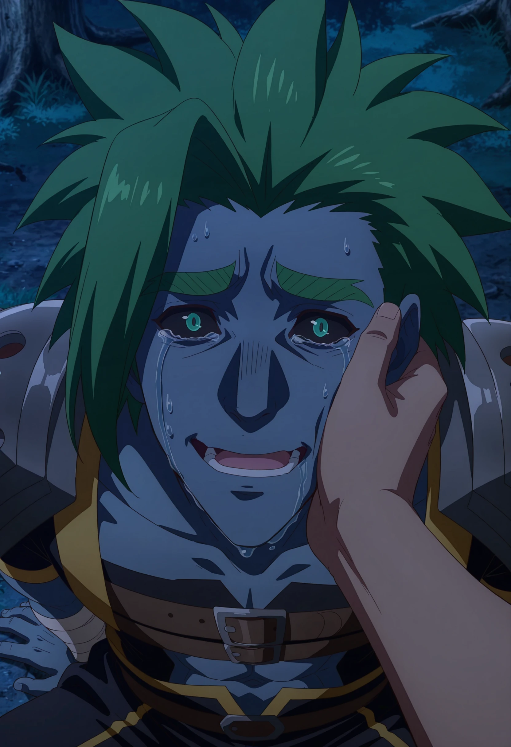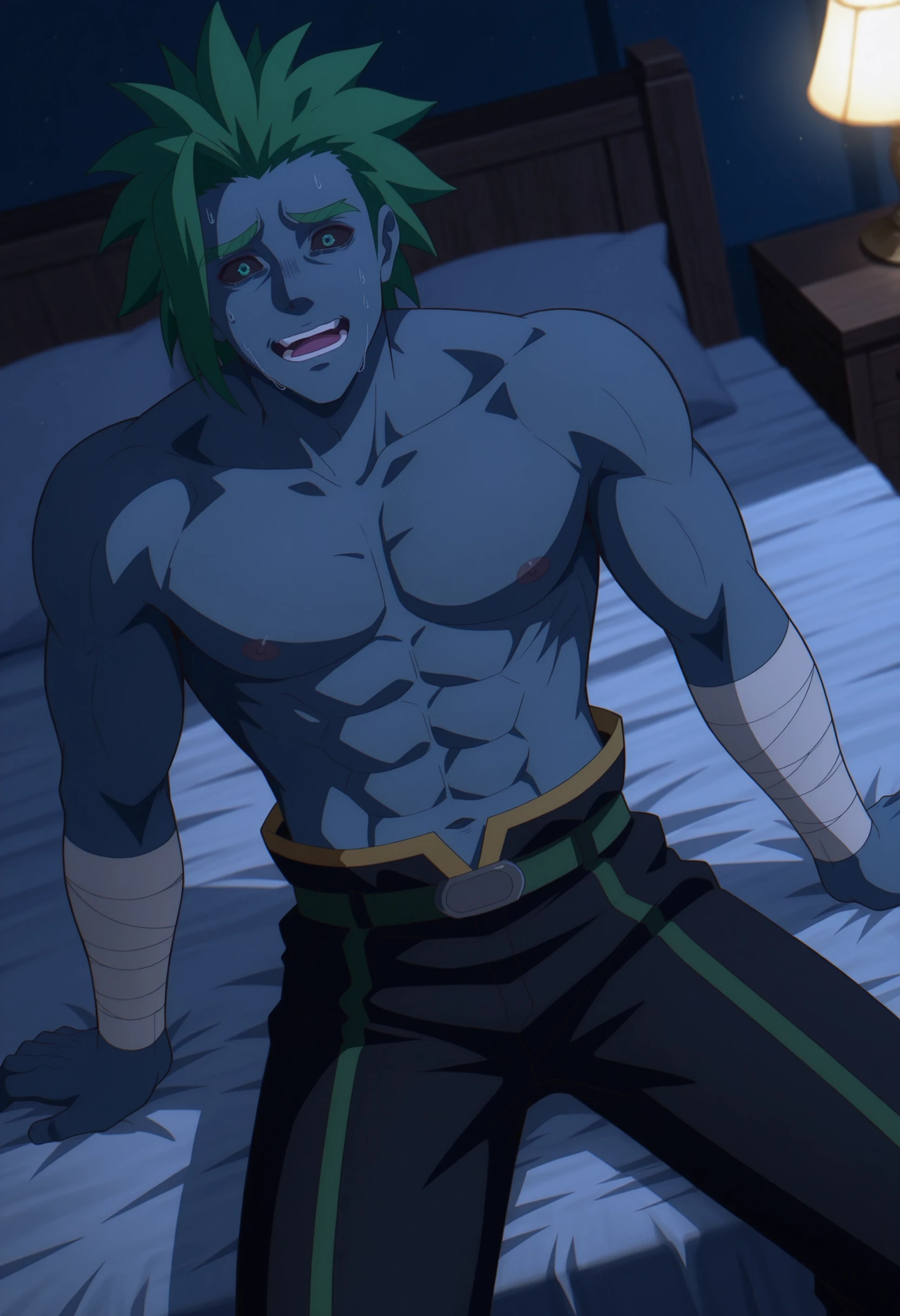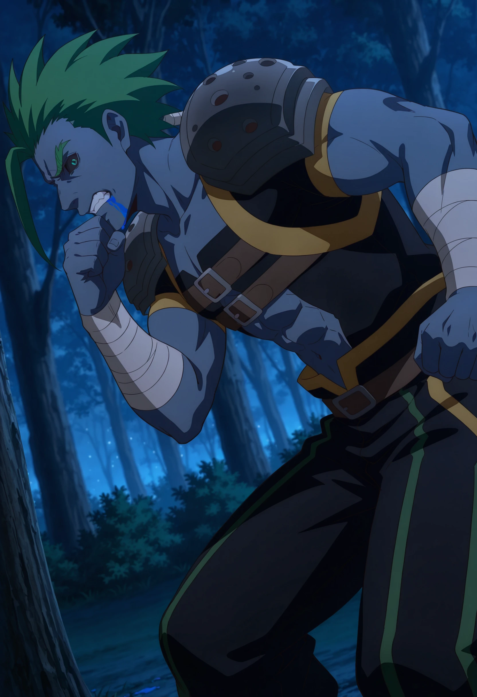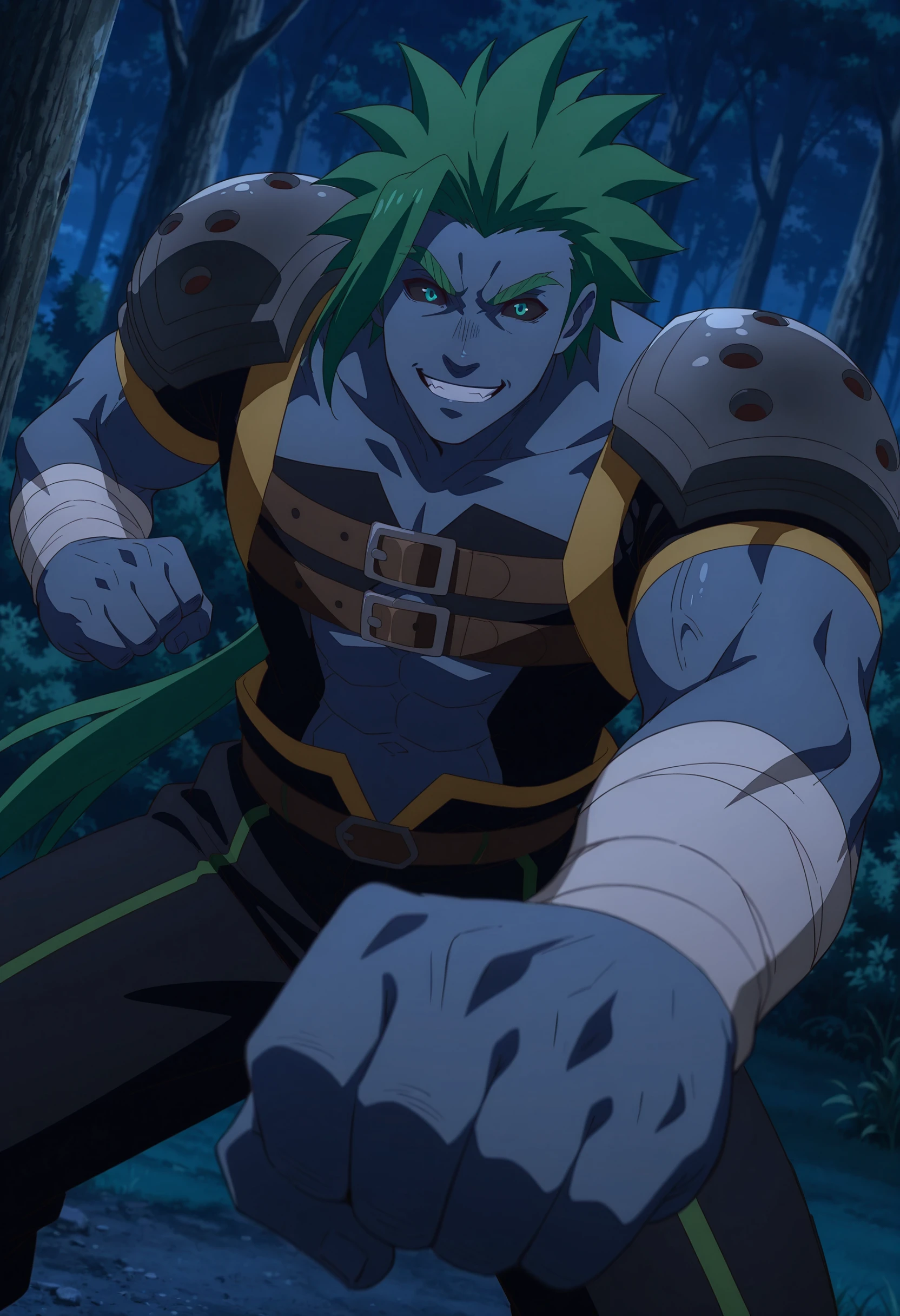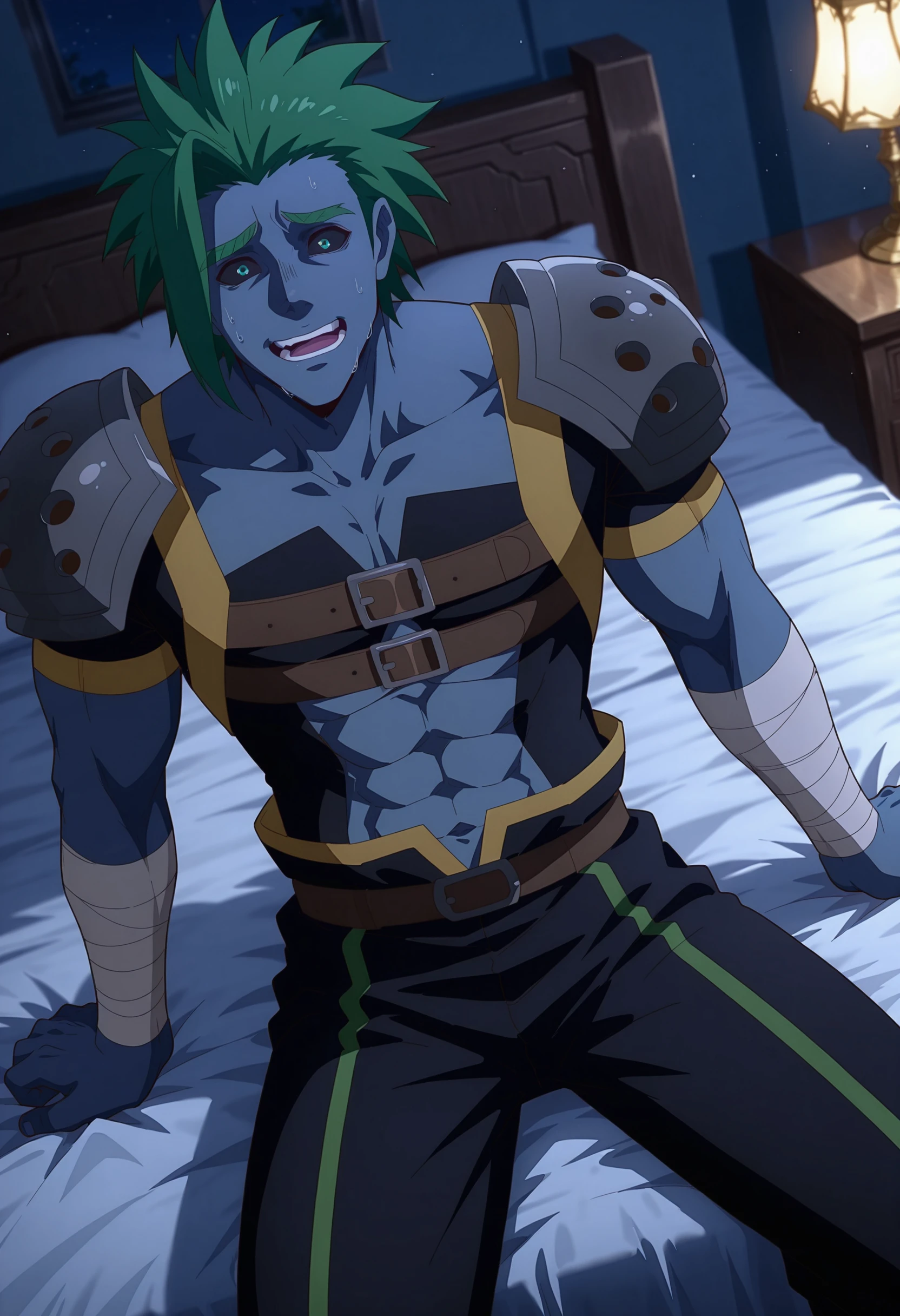 blue skin, black sclera, long green ponytail, black and yellow armor, brown straps on chest, shoulder armor with hole, bandages on forearms, bare abs