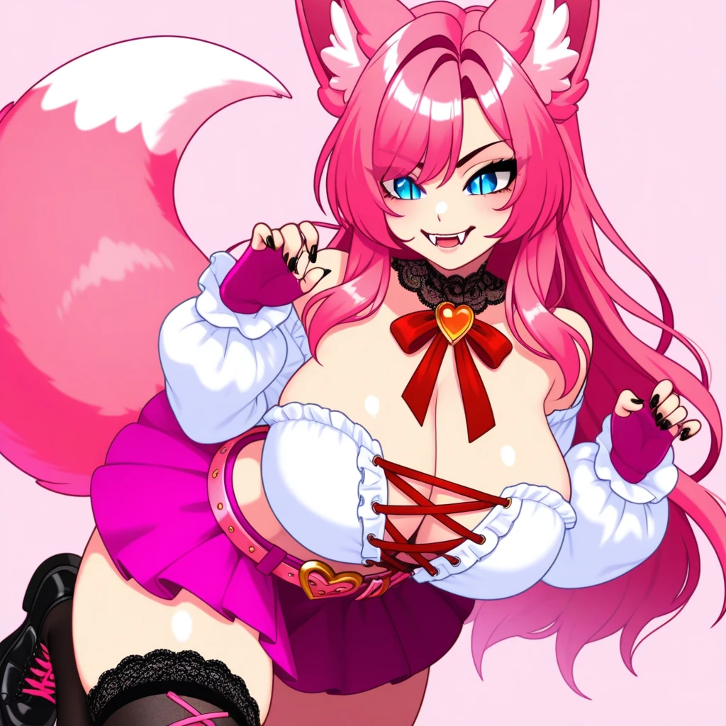 Main Outfit: White blouse, cross-laced blouse, pluffy sleeves, magenta skirt, pink heart belt, pink fingerless gloves, black nails, black lace collar, red ribbon, orange brooch, black leg stocking, black shoes