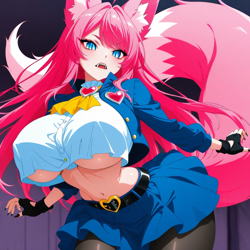 Outfit 2.5: black nails, white cropped shirt, yellow ascot, heart brooch, black fingerless gloves, blue cropped jacket, blue skirt, black heart belt, pantyhose, white platform heels,