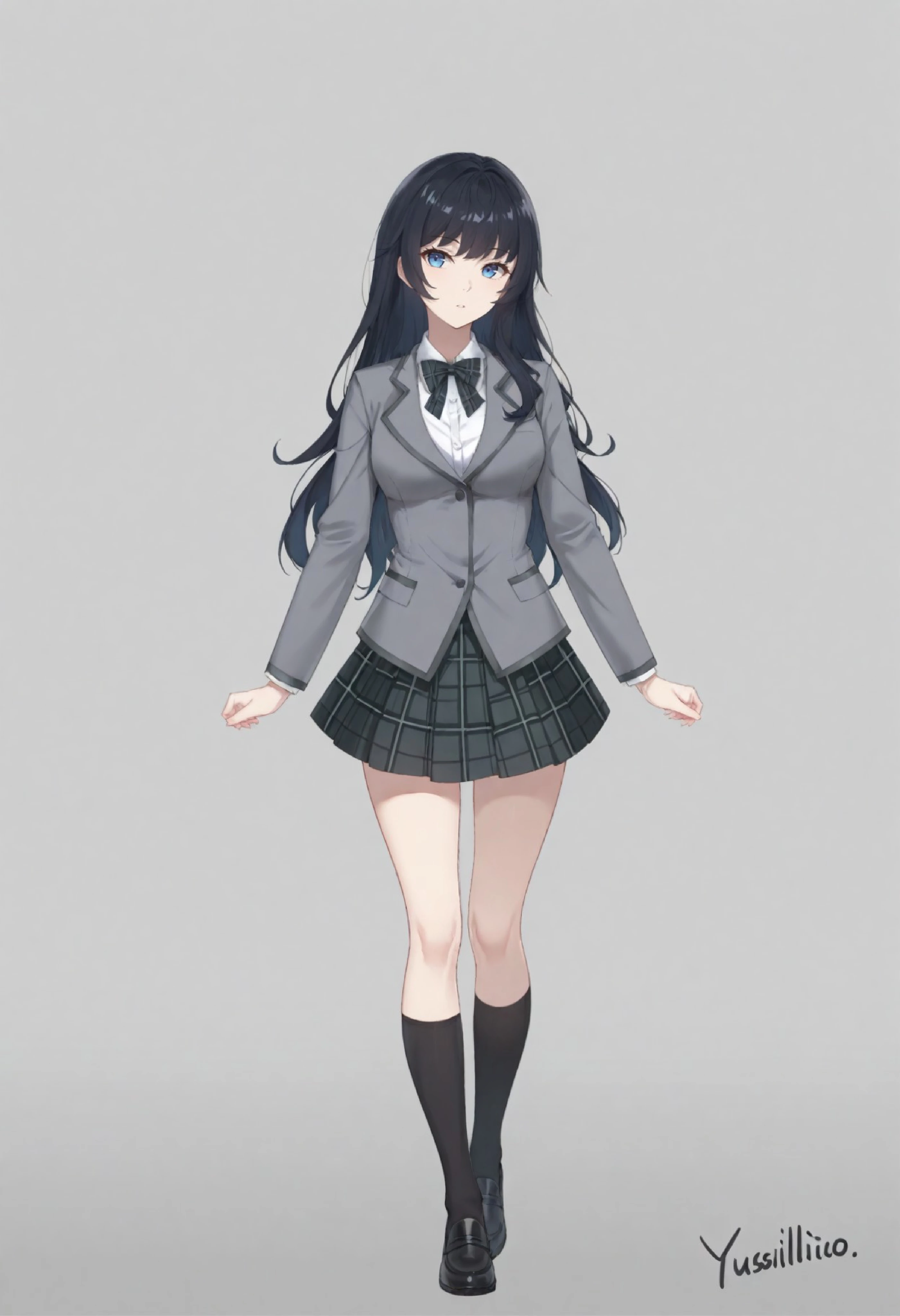 xicheng,1girl,solo,black hair,long hair,very long hair,bangs,hair between eyes,blue eyes,,,school uniform,grey blazer,grey blazer jacket,white shirt,white collared shirt,long sleeves,bow,plaid skirt,grey plaid skirt,pleated skirt,short skirt,jacket,blazer,black bow tie,loafers,black loafers,